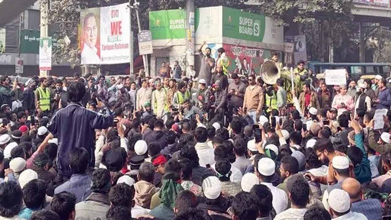চতুর্থ দিনের মতো শহীদ শরিফ ওসমান হাদির হত্যার বিচারের দাবিতে রাজধানীর শাহবাগ মোড় অবরোধ করে অবস্থান কর্মসূচি পালন করছে ইনকিলাব মঞ্চ।