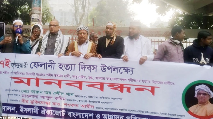 আধিপত্য প্রতিরোধ আন্দোলন, ইসলামী ঐক্যজোট বাংলাদেশ ও আগ্রাসন প্রতিরোধ আন্তর্জাতিক আন্দোলনের যৌথ উদ্যোগে "৭ই জানুয়ারি ফেলানী হত্যা দিবস" উপলক্ষে ৭ই জানুয়ারি, ২০২৬, বুধবার সকাল ১১টায় জাতীয় প্রেসক্লাবের সামনে “শহীদ ফেলানীসহ সকল সীমান্ত হত্যা ও আধিপত্যবাদী হত্যার বিচারের দাবীতে মানববন্ধন” অনুষ্ঠিত হয়।