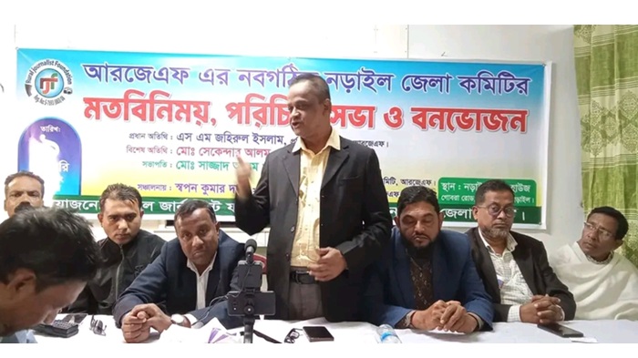 গত ৯ জানুয়ারী(শুক্রবার) নড়াইল জেলা শহরের ধোপাখোলা মোড় সংলগ্ন নড়াইল কফি হাউজে অনুষ্ঠিত উক্ত সভায় আরজেএফ’র সিনিয়র যুগ্ম মহাসচিব ও নড়াইল জেলা কমিটির নবনির্বাচিত সভাপতি সাজ্জাদ আলম খান সজলের সভাপতিত্বে ও সাধারণ সম্পাদক স্বপন কুমার দাসের সঞ্চালনায় এবং নির্বাহী সদস্য উজ্জ্বল খানের উপস্থাপনায় প্রধান অতিথি হিসেবে উপস্থিত ছিলেন আরজেএফ এর প্রতিষ্ঠাতা চেয়ারম্যান এস এম জহিরুল ইসলাম।