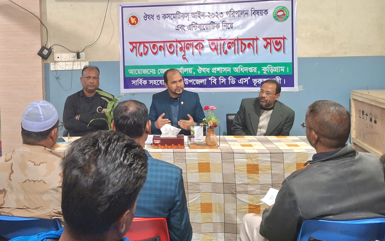 ঔষধ প্রশাসন অধিদপ্তরের আয়োজনে বাংলাদেশ কেমিস্টস অ্যান্ড ড্রাগিস্টস সমিতি (বিসিডিএস) ভুরুঙ্গামারী উপজেলা শাখার সহযোগিতায় বৃহস্পতিবার (১৫ জানুয়ারি ) দুপুরে মাহবুব ক্লিনিকে এ আলোচনা সভা অনুষ্ঠিত হয়।