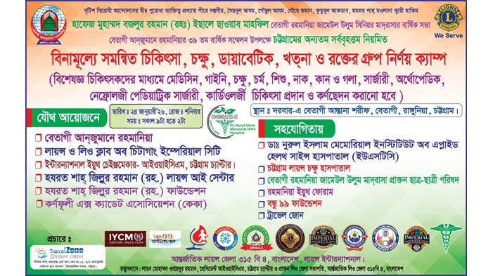 স ম জিয়াউর রহমান, চট্টগ্রাম প্রতিনিধি: সৈয়দুল আযম আল্লামা হযরত ক্বারী হাকিম হাফেজ মুহাম্মদ বজলুর রহমান মোহাজেরে মক্কী (রহঃ) এর বার্ষিক পবিত্র ইছালে ছাওয়াব মাহফিল, বেতাগী রহমানিয়া জামেউল উলুম সিনিয়র মাদ্রাসার বার্ষিক সভা ও বেতাগী আনজুমানে রহমানিয়ার ৩৯ তম বার্ষিক সম্মেলন উপলক্ষে ৫০ জন বিশেষজ্ঞ ডাক্তারের সমন্বয়ে চট্টগ্রামের নিয়মিত সর্ববৃহত্তম বিনামূল্যে সমন্বিত চিকিৎসা, চক্ষু, ডায়াবেটিক ও রক্তের গ্রুপ নির্ণয় ও খতনা ক্যাম্প আগামী ২৪ জানুয়ারি ২০২৬ শনিবার সকাল ৯টা হতে ২টা পর্যন্ত রাঙ্গুনিয়া দরবার-এ বেতাগী আস্তানা শরীফে অনুষ্ঠিত হবে ।