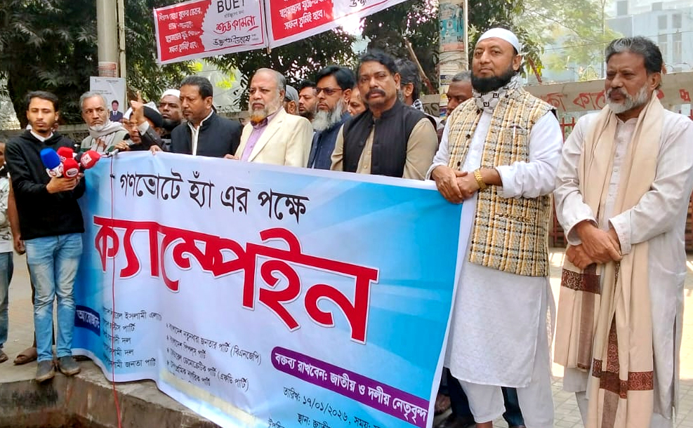 অদ্য ১৭ জানুয়ারি শনিবার সকালে জাতীয় প্রেসক্লাবের সামনে বাংলাদেশ লিবারেল ইসলামী এ্যালায়েন্সসহ ১০টি রাজনৈতিক দলের উদ্যোগে জাতীয় সংসদ নির্বাচন ও গণভোটে হ্যাঁ এর পক্ষে ক্যাম্পেইন অনুষ্ঠিত হয়। বক্তারা সারাদেশের ভোটারদেরকে গণভোটে হ্যাঁ এর পক্ষে জাগরণ সৃষ্টি করার জন্য উদাত্ত আহ্বান জানিয়ে ফ্যাসিবাদমুক্ত আগামী রাষ্ট্র গঠনের আহ্বান জানান। ভারসম্যপূর্ণ ক্ষমতার জন্য এবং জুলাই সনদকে আইনী ভিত্তি দেওয়ার উদ্দেশ্যে হ্যাঁ ভোটের পক্ষে থাকার জন্য গুরুত্ব প্রদান করে বক্তব্য রাখেন নেতৃবৃন্দ। উক্ত সভায় প্রধান অতিথি হিসেবে উপস্থিত ছিলেন লেঃ কর্ণেল (অবঃ) হাসিনুর রহমান বীর প্রতীক। প্রধান বক্তা ছিলেন জুলাই বিপ্লবের সর্বকণিষ্ঠ শহীদ জাবের ইব্রাহিমের পিতা কবির হোসাইন। সভায় সভাপতিত্ব করেন এডভোকেট মোঃ মঈনুদ্দিন। সভায় বিশেষ অতিথি হিসেবে বক্তব্য রাখেন দেশপ্রেমিক নাগরিক পার্টির চেয়ারম্যান ও নাগরিক মঞ্চের প্রধান সমন্বয়কারী আহসান উল্লাহ শামীম, বাংলাদেশ জাতীয় হিন্দু মহাজোটের মহাসচিব ড. গোবিন্দ চন্দ্র প্রামাণিক, বাংলাদেশ ইসলামী দলের চেয়ারম্যান মোঃ হুমায়ুন কবির, বাংলাদেশ জাস্টিস পার্টির চেয়ারম্যান আবুল কাশেম মজুমদার, বাংলাদেশ নতুনধারা জনতা পার্টির আহ্বায়ক মোহাম্মদ আব্দুল আহাদ নূর, ইসলামী আন্দোলন বাংলাদেশের কেন্দ্রীয় দপ্তর সম্পাদক মাওলানা লোকমান হোসেন জাফরি, ৯০’র গণআন্দোলনের নেতা ও জাগপা প্রেসিডিয়াম সদস্য আসাদুর রহমান খান, বাংলাদেশ কল্যাণ পার্টির মহাসচিব মোঃ আবু হানিফ, জাতীয় ঐক্য সংহতি পরিষদের আহ্বায়ক মোঃ নাজিমুল হক, ইসলামি সমাজতান্ত্রিক দলের চেয়ারম্যান ইঞ্জিনিয়ার হাফিজুর রহমান, বাংলাদেশ ডেমোক্রেটিক পার্টির চেয়ারম্যান জাহাঙ্গীর হাওলাদার, বাংলাদেশ পিপলস্ পার্টির চেয়ারম্যান মোঃ সিদ্দিকুর রহমান খান, বাংলাভাষা সাহিত্য পরিষদের চেয়ারম্যান কবি জাহিদ আল রাজী, বাংলাদেশ ন্যাপ এর সেক্রেটারী জেনারেল ইঞ্জিনিয়ার আব্দুল বারেক, সংবিধান বিষয়ক জনস্বার্থ পার্টির আহ্বায়ক মোঃ শহীদুল ইসলাম হাওলাদার, সুশীল ফোরামের সেক্রেটারী মোঃ শহীদুল্লাহ, ন্যাশনাল লেবার পার্টি (এনএলপি) মহাসচিব লায়ন এড. মোঃ জাকির হোসেন, মানবাধিকার প্রতিষ্ঠা ও বাস্তবায়ন সংস্থার সেক্রেটারী জেনারেল মোঃ নুরুল ইসলাম, বাংলাদেশ লিবারেল ইসলামী এ্যালায়েন্স অফিস সম্পাদক এডভোকেট জি.এম. জয়নুল আবেদীন, সাংগঠনিক সম্পাদক এ কে এম আলমগীর, বাংলাদেশ ইসলামী দলের যুগ্ম মহাসচিব মাওলানা মোঃ সাব্বির হোসাইন, এডভোকেট জিল্লুর রহমান তালুকদার, সাংবাদিক মোকাররম বিল্লাহ প্রমুখ। প্রধান অতিথির বক্তব্যে কর্ণেল হাসিনুর রহমান বলেন, ৯০’র গণআন্দোলনে বাংলাদেশ ফ্যাসিবাদ মুক্ত হয়েছে, ক