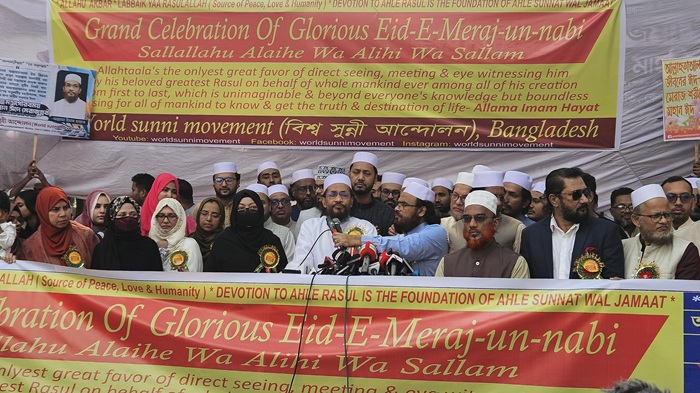 সত্য ও জীবনের উপলব্ধির জন্য অতি অপরিহার্য মৌলিক ঈমানী বিষয় ঈদে মেরাজ শরীফের মহান তাৎপর্য্য তুলে ধরার লক্ষ্যে বিশ্ব সুন্নী আন্দোলনের উদ্যোগে আজ ঢাকা প্রেসক্লাব সম্মুখে সমাবেশ ও সমাবেশ শেষে বর্ণাঢ্য শোভাযাত্রা অনুষ্ঠিত হয়।