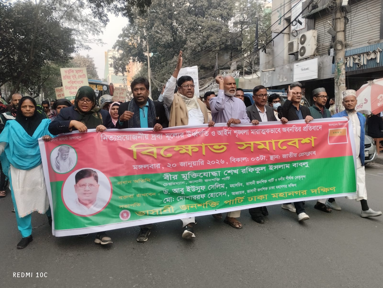 ভাসানী জনশক্তি পার্টি ঢাকা মহানগর দক্ষিণের উদ্যোগে দ্রব্যমূল্যের ঊর্ধ্বগতি ও আইন-শৃঙ্খলার অবনতির বিরুদ্ধে বিক্ষোভ সমাবেশ অনুষ্ঠিত হয়েছে।পুরাতন পল্টন চায়ের গলি দলীয় কার্যালয়ের সামনে থেকে মিছিল শুরু হয়ে বিজয় নগর, পানির টাংকি, পুরাতন পল্টন, তোপখানা রোড হয়ে প্রেসক্লাবে গিয়ে সমাবেশে মিলিত হয়। ঢাকা মহানগর দক্ষিণের আহবায়ক মোঃ মোশারফ হোসেনের সভাপতিত্বে প্রধান অতিথি হিসেবে বক্তব্য রাখেন ভাসানী জনশক্তি পার্টি এবং গণতন্ত্রের মঞ্চে শীর্ষ নেতা বীর মুক্তিযোদ্ধা শেখ রফিকুল ইসলাম বাবলু।