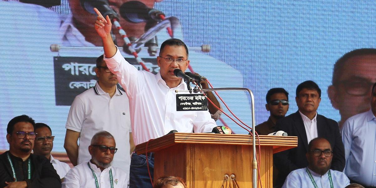 তারেক রহমান বলেন, গত ১৫ বছরে সমবেত হওয়ার এই প্রেক্ষাপট তৈরি করতে অসংখ্য মানুষ প্রাণ দিয়েছেন। বাক্স্বাধীনতা কেড়ে নেওয়া হয়েছে, বিএনপিসহ লাখো সাধারণ মানুষ নির্যাতিত, পঙ্গু ও নিঃস্ব হয়েছেন। ব্যালট ছিনতাই ও ডামি নির্বাচনের মাধ্যমে জনগণের ভোটাধিকার হরণ করা হয়েছে।