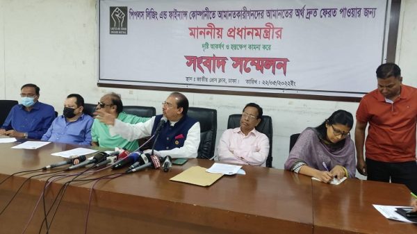 রোববার ( ২২ মে) রাজধানীর জাতীয় প্রেসক্লাবে পিপলস লিজিং অ্যান্ড ফাইন্যান্সিয়াল সার্ভিস লিমিটেডের প্রায় ৬০০০ ব্যক্তি ও ক্ষুদ্র বিনিয়োগকারীদের প্রায় ৭৫০ কোটি টাকা আমানত ফেরত দেয়ার দাবিতে অনুষ্ঠিত সংবাদ সন্মেলনে আমানতকারীদের পক্ষে তিনি এসব কথা বলেন।