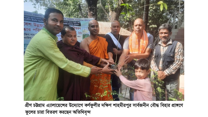 স ম জিয়াউর রহমান, চট্টগ্রাম প্রতিনিধি: চট্টগ্রাম বিভাগীয় পরিবেশ, জলবায়ু, কৃষি ও সেবামূলক সংগঠন গ্রীন চট্টগ্রাম এ্যালায়েন্স ও অধিকার বঞ্চিত শিশু ফাউন্ডেশনের আয়োজনে চট্টগ্রাম জেলা প্রশাসন, কর্ণফুলী উপজেলা ভূমি অফিস ও ওসমানি বিরিয়ানি হাউসের সার্বিক সহযোগিতায় ২৭ জানুয়ারি, মঙ্গলবার, সকাল ১১টায় কর্ণফুলী উপজেলাধীন জুলধা ইউনিয়নের দক্ষিণ শাহমীরপুর গ্রামের সার্বজনীন বৌদ্ধ বিহার প্রাঙ্গণে পরিষ্কার পরিচ্ছন্নতা অভিযান ও পরিবেশ উন্নয়নে বিভিন্ন ধরনের ফুলের চারা রোপণ ও বিতরণ করা হয়।