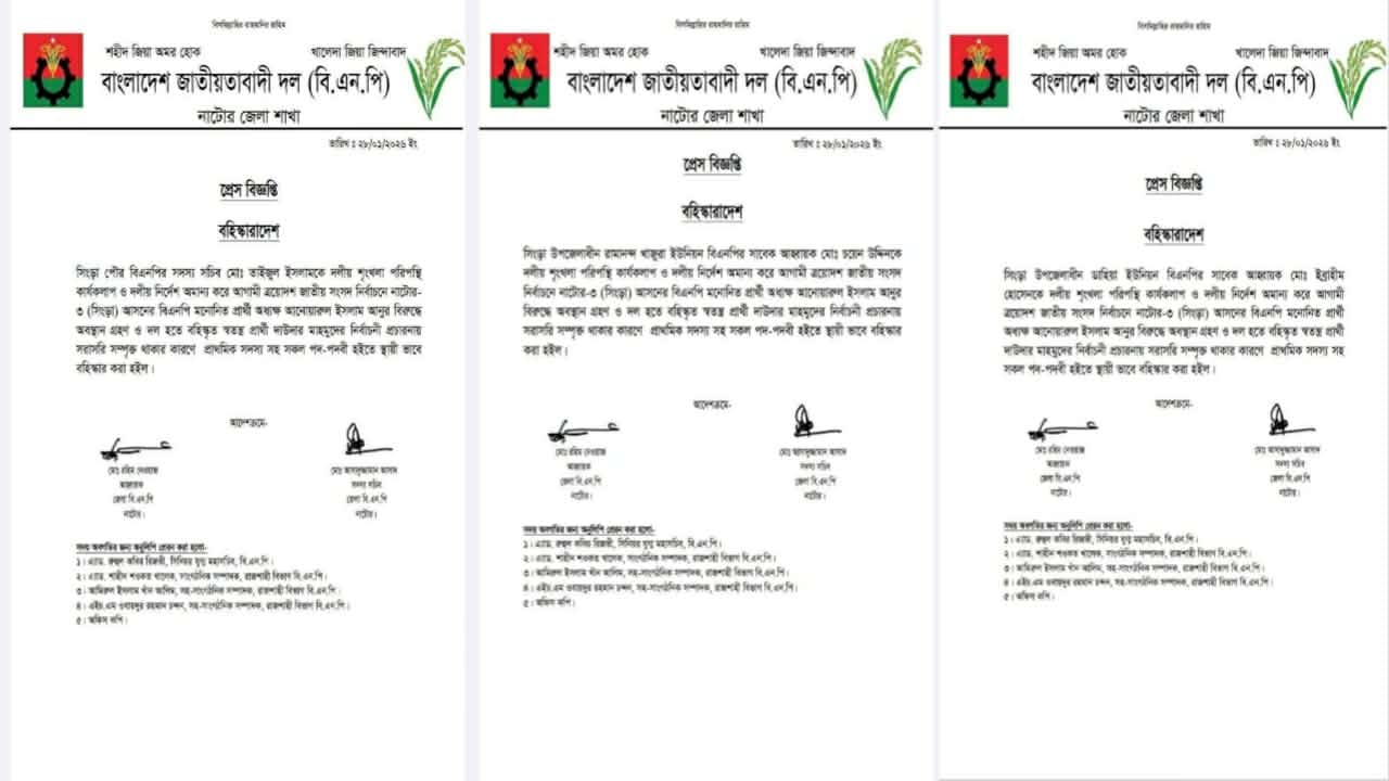 বহিষ্কৃত নেতারা হলেন: সিংড়া পৌর বিএনপির সদস্য সচিব তাইজুল ইসলাম, ১২ নং রামানন্দ খাজুরা ইউনিয়ন বিএনপির সাবেক আহ্বায়ক মোঃ চয়েন উদ্দিন, ডাহিয়া ইউনিয়ন বিএনপির সাবেক আহ্বায়ক মোঃ ইব্রাহীম হোসেন।