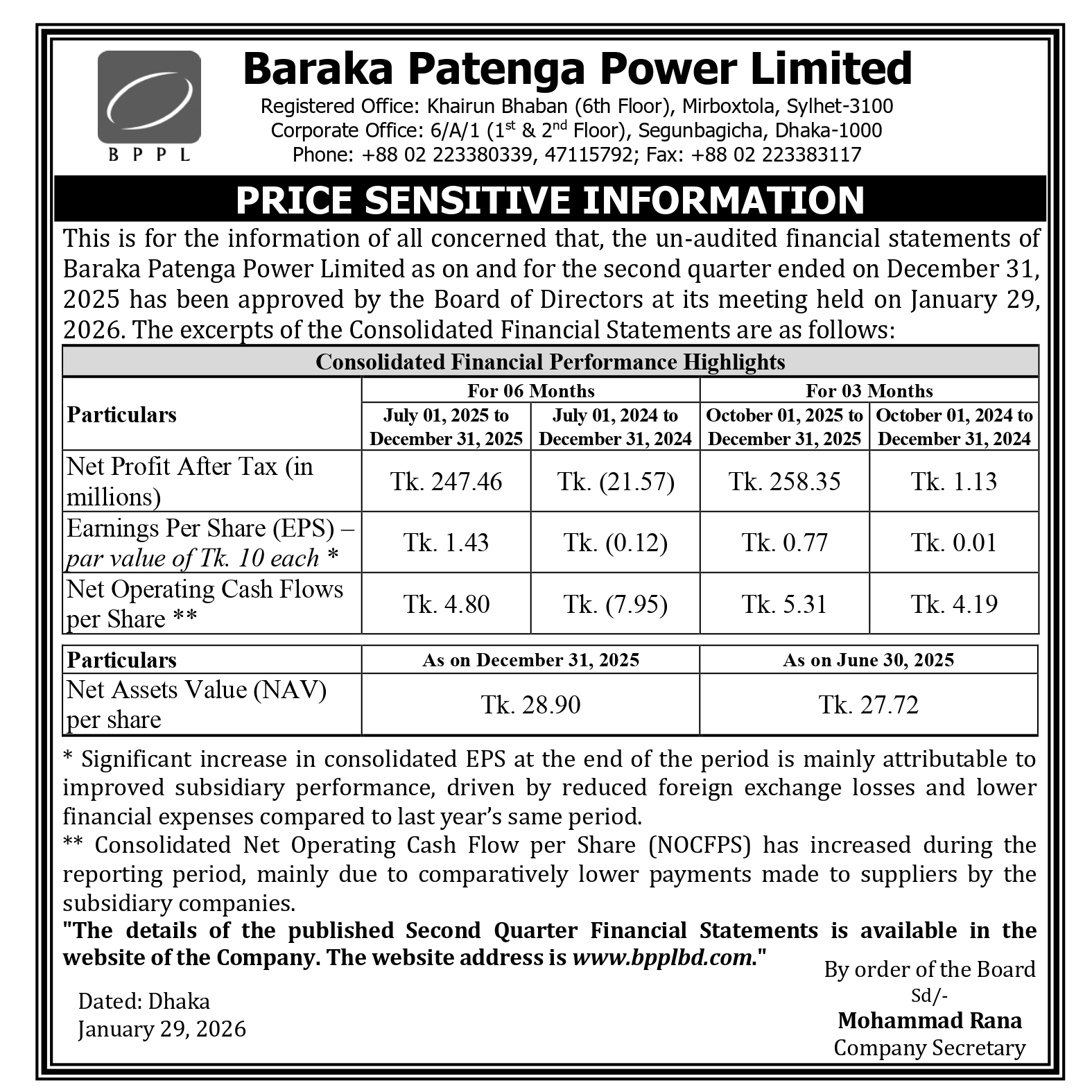 Price Sensitive Information of Baraka Patenga Power Limited