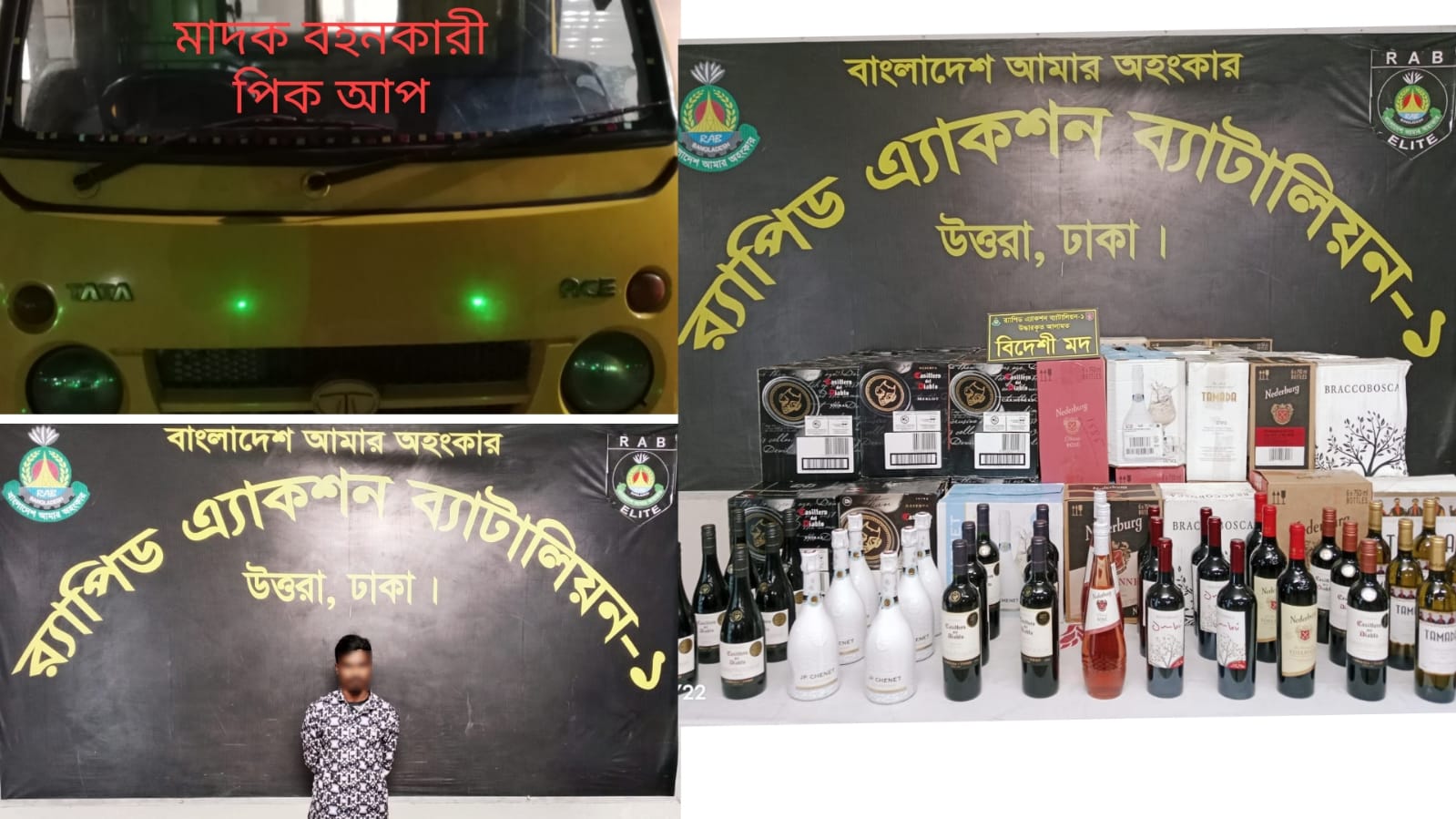 সুমন শাহ্, বিশেষ প্রতিনিধি (ক্রাইম): র্যাপিড এ্যাকশন ব্যাটালিয়ন মাদকের বিরুদ্ধে জিরো টলারেন্স নীতির আলোকে মাদকদ্রব্য সহ সংঘবদ্ধ অপরাধ দমনে নিয়মিত অভিযান পরিচালনা করে আসছে। এরই ধারাবাহিকতায় গত ০৬ ফেব্রুয়ারি ২০২৬ ইং তারিখ রাত ০১.১০ ঘটিকায় র্যাব-১, উত্তরা, ঢাকা এর একটি আভিযানিক দল তথ্য প্রযুক্তি ও গোপন সংবাদের ভিত্তিতে জানতে পারে যে, ডিএমপি, ঢাকার গুলশান থানা এলাকায় কতিপয় মাদক ব্যবসায়ী বিপুল পরিমাণ বিদেশী মদ নিয়ে গুলশান-১ হইতে মহাখালী এলাকার দিকে যাচ্ছে। উক্ত সংবাদ প্রাপ্তির সাথে সাথে র্যাবের আভিযানিক দলটি ডিএমপি ঢাকার গুলশান থানাধীন গুলশান-১, রোড নং-৯, DIOUS Exclusive Office Furniture ভবনের সামনে পাকা রাস্তার উপর চেকপোস্ট পরিচালনা করে, উক্ত চেকপোস্ট পরিচালনা কালে গুলশান-১ হতে মহাখালীর দিকে আগত একটি পিকআপ ভ্যানকে র্যাবের চেকপোস্টকারী দল থামানোর সংকেত দিলে র্যাব এর উপস্থিতি টের পেয়ে কতিপয় ব্যক্তি পিকআপ ভ্যান রেখে পালিয়ে যাওয়ার চেষ্টাকালে র্যাবের আভিযানিক টিমের সহায়তায় কামাল মিয়া(২২), পিতা- আক্কাস মিয়া , গ্রাম-ভাসাটি , থানা- নান্দাইল , জেলা- ময়মনসিংহ , এ/পি- রামপুরা ওয়াপদা রোড , থানা- হাতিরঝিল, ডিএমপি, ঢাকা’কে ৬৭১ বোতল (৫০৩.২৫ লিটার) বিদেশী মদ ও পিকআপসহ গ্রেফতার করা হয়।