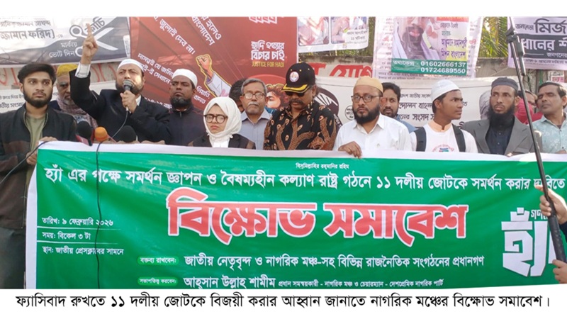 আগামী ১২ ফেব্রুয়ারি অনুষ্ঠিতব্য ত্রয়োদশ জাতীয় সংসদ নির্বাচনে বৈষম্যহীন কল্যাণ রাষ্ট্র গঠনের লক্ষ্যে ১১ দলীয় জোটকে বিজয়ী করার আহ্বান জানিয়েছেন নাগরিক মঞ্চের নেতৃবৃন্দ। সোমবার (৯ ফেব্রুয়ারি) জাতীয় প্রেসক্লাবের সামনে আয়োজিত এক বিক্ষোভ সমাবেশ থেকে দেশবাসীর প্রতি এই উদাত্ত আহ্বান জানানো হয়।