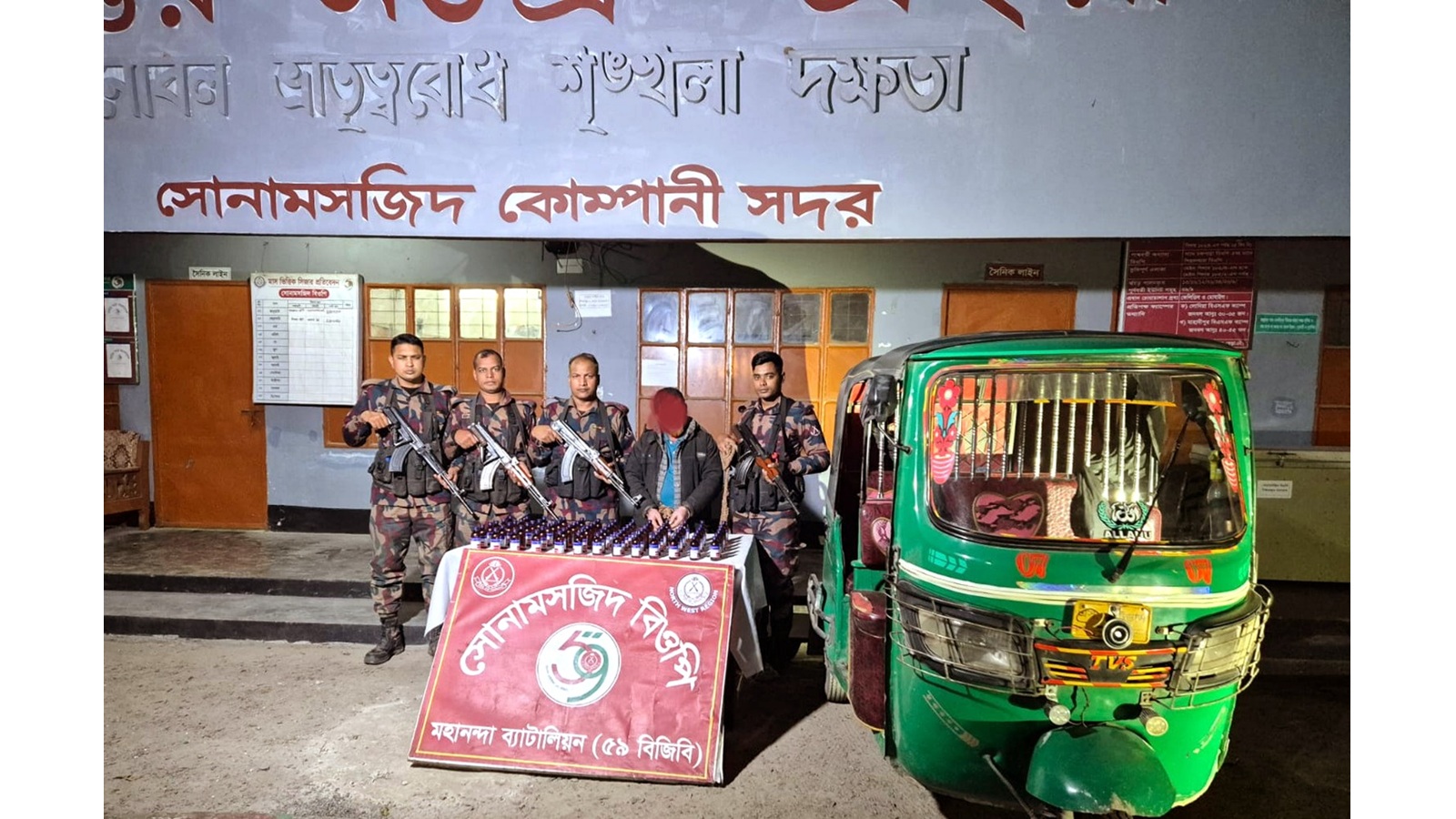 গোপন সংবাদের ভিত্তিতে ১৫ ফেব্রুয়ারি ২০২৬ তারিখ রাত ৯:০০ টার সময় সোনামসজিদ বিওপি’র একটি চৌকস টহল দল সীমান্ত পিলার ১৮৪/৪-এস হতে আনুমানিক ০১ কিঃ মিঃ বাংলাদেশের অভ্যন্তরে উপজেলার কয়লাবাড়ী গ্রামস্থ নতুন ট্রাক টার্মিনাল এলাকায় এ অভিযান পরিচালনা করে। উক্ত অভিযানে টহল দল ০১ জন আসামী মোঃ ফরিদ (৪৫), পিতা-মৃত আব্দুল জব্বার, গ্রাম-চককৃর্ত্তি, পোষ্ট-কানসাট, থানা-শিবগঞ্জ, জেলা-চাঁপাইনবাবগঞ্জকে ফেন্সিডিল এর বিকল্প ৭৮ বোতল ভারতীয় নেশাজাতীয় Eskuf DX সিরাপ এবং ০১টি সিএনজি (TVS) সহ আটক করতে সক্ষম হয়। বিজিবি’র পক্ষ হতে আটক আসামীর বিরুদ্ধে মামলা করতঃ নেশাজাতীয় সিরাপ এবং সিএনজি শিবগঞ্জ থানায় হস্তান্তরের কাজ চলমান। প্রসঙ্গত, এই ব্যাটালিয়ন বিগত ০৩ মাসে সীমান্তে অভিযান চালিয়ে এ যাবৎ ৩,১০০ বোতল ফেন্সিডিল এর বিকল্প কয়েক ধরনের নেশাজাতীয় সিরাপ আটক করেছে।