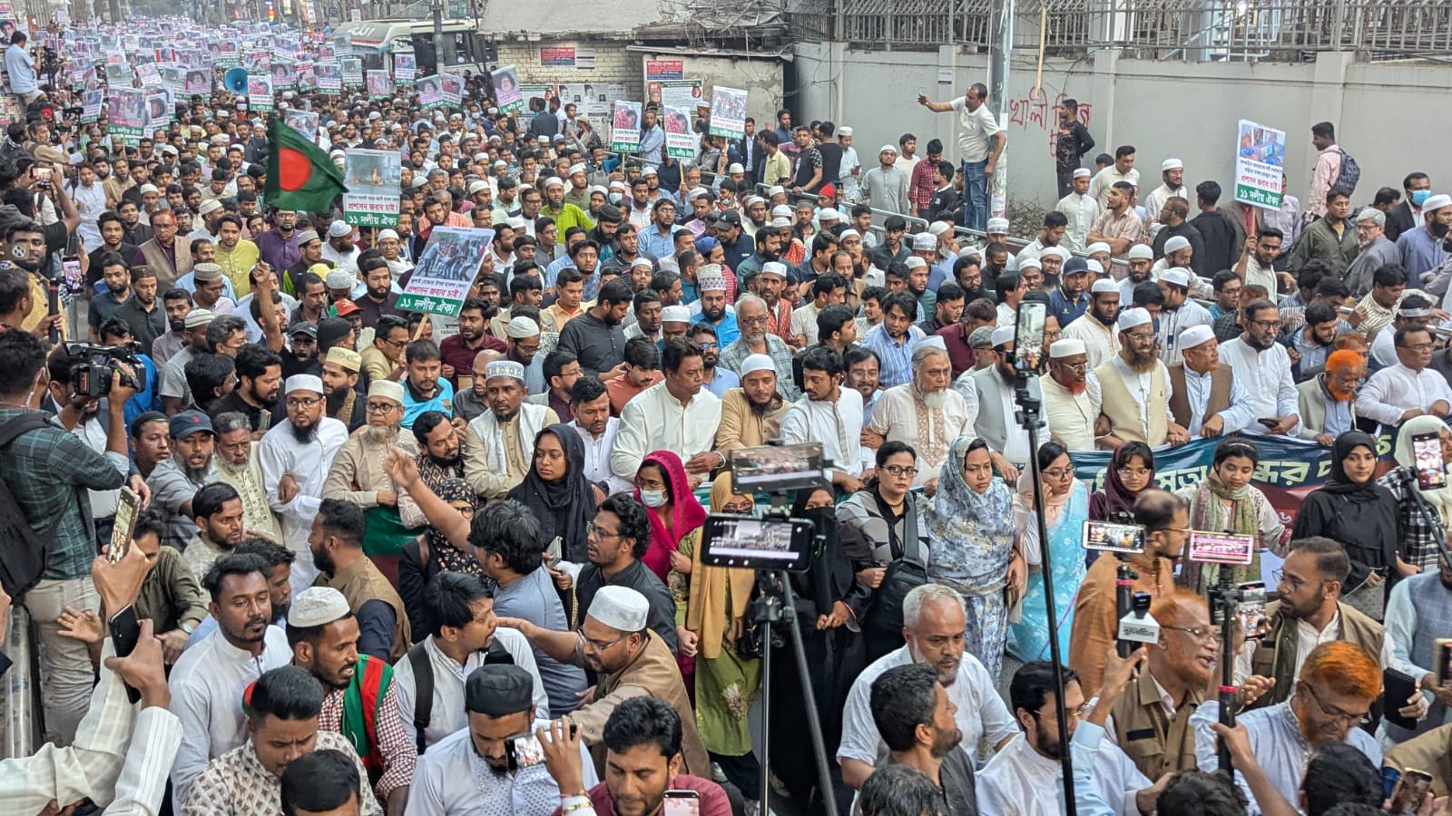 বাংলাদেশ জামায়াতে ইসলামীর সেক্রেটারি জেনারেল, সাবেক এমপি অধ্যাপক মিয়া গোলাম পরওয়ারের সভাপতিত্বে অনুষ্ঠিত সমাবেশে ১১ দলীয় ঐক্যজোটের শীর্ষ নেতৃবৃন্দের মধ্যে বিশেষ অতিথির বক্তব্যে যথাক্রমে জাতীয় নাগরিক পার্টির (এনসিপি) মুখ্য সমন্বয়ক নাসিরুদ্দীন পাটোয়ারী বলেন, আমরা জাতির সামনে ভোটচোরদের উন্মোচিত করতে পেরেছি। ওরা শুধু ভোট চুরি করেনি, বরং জনগণের ভোট ডাকাতি করেছে। তিনি বলেন, যারা ইঞ্জিনিয়ারিং ইলেকশনের মাধ্যমে ক্ষমতা গ্রহণ করেছে, তারা যদি জনগণের ওপর জুলুম করে, তবে আমরা বসে থাকব না। শহীদ ওসমান হাদী হত্যার বিচার সম্পন্ন করতে তিনি সংশ্লিষ্টদের প্রতি আহ্বান জানান।