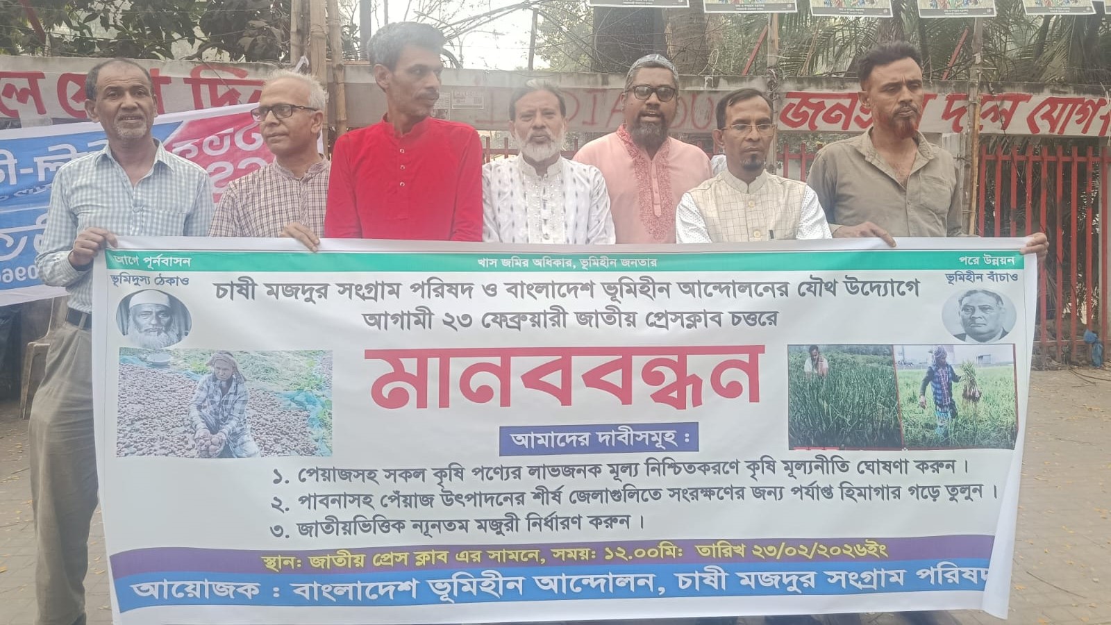 আজ ২৩ ফেব্রুয়ারি ২০২৬ সোমবার দুপুর ১২ টায় চাষী মজদুর সংগ্রাম পরিষদ ও বাংলাদেশ ভূমিহীন আন্দোনের যৌথ উদ্যোগের ৩ দফা দাবিতে জাতীয় প্রেসক্লাব চত্ত্বরে এক এক মানববন্ধন কর্মসূচি অনুষ্ঠিত হয়।