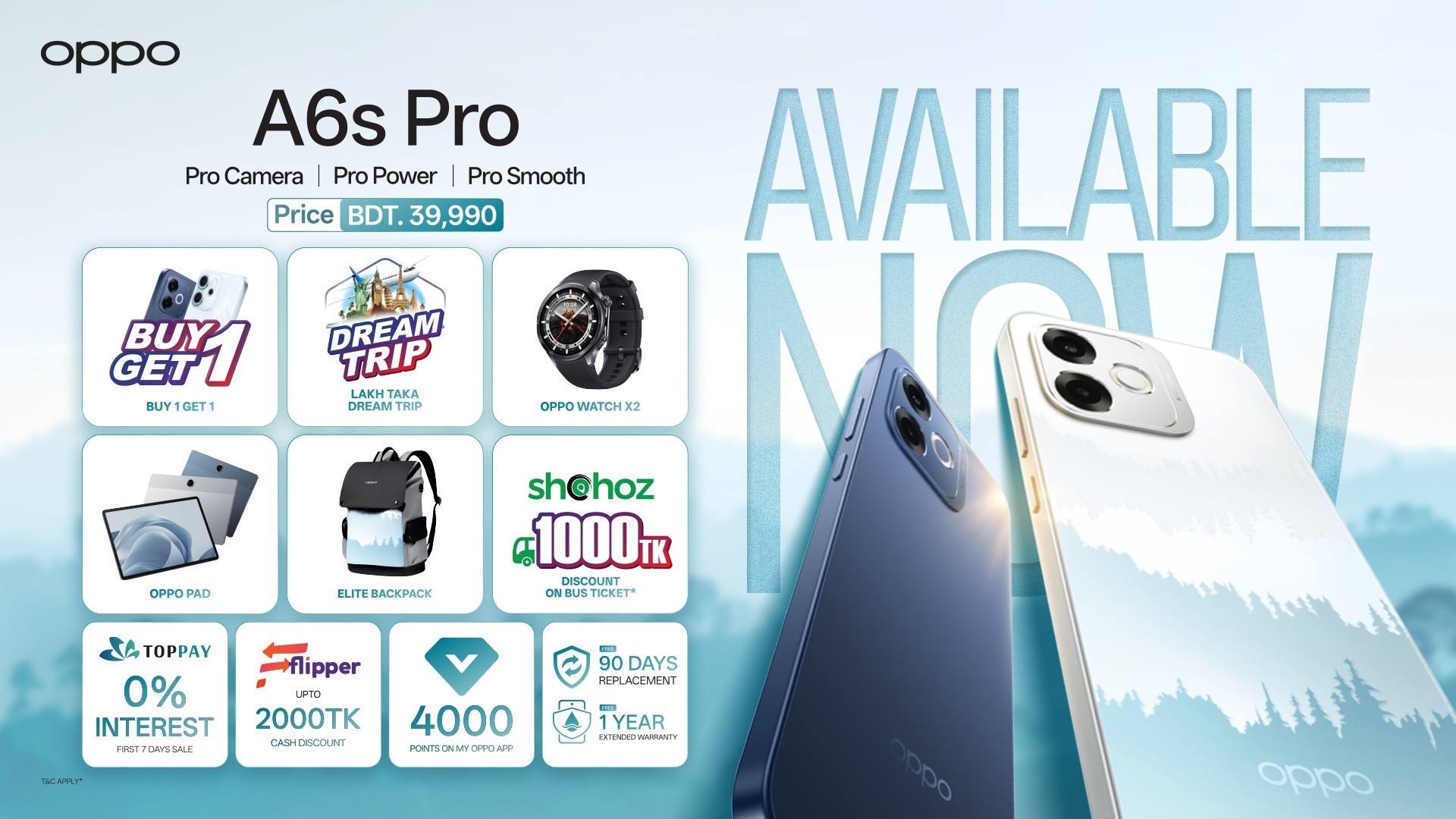 ক্রেতাদের জন্য আরও রয়েছে আকর্ষণীয় প্রোমোশনাল ক্যাম্পেইন, যেখানে তারা জিতে নিতে পারেন একটি কিনলে একটি ফ্রি (বোগো) অফার, লাখ টাকা ড্রিম ট্রিপ, অপো ওয়াচ এক্স২, অপো প্যাড ৩ এবং অপো প্যাড এসই।