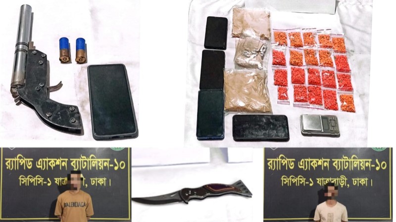 র্যাব-১০ এর উক্ত আভিযানিক দল মাদক অভিযান পরিচালনা শেষে ফেরার সময় গতকাল ১১/০৩/২০২৬ তারিখ বিকাল অনুমান ১৭.৩৫ ঘটিকায় ডিএমপি, ঢাকার ডেমরা থানাধীন সারুলিয়াস্থ জোকা সান্দিরা বালুরঘাট পৌছা মাত্র র্যাবের সরকারি পিকআপ গাড়ির উপস্থিতি টের পেয়ে একজন লোক উত্তর দিকে দৌড়ে পালানোর চেষ্টা করলে র্যাব-১০ এর সদস্যগণ তাকে আটক করে। আটককৃত ব্যক্তির উক্ত স্থান হতে দৌড়ে পালানোর কারন জিজ্ঞাসা করলে তার কথাবার্তা ও আচরণে সন্দেহের সৃষ্টি হওয়ায় তাকে বিধি মোতাবেক তল্লাশী করে তার পরিহিত প্যান্টের কোমরের পিছনে গোজা অবস্থায় ০১ (এক) টি মাঝারি আকৃতির লোহার তৈরি দেশীয় একনলা বন্দুক এবং পরিহিত প্যান্টের ডান পকেট হতে ০২ টি নীল ও সোনালী রংয়ের ১২ বোরের সীসার তৈরি কার্তুজ উদ্ধার করা হয়। আটককৃত ব্যক্তির নাম মোঃ হাসিবুল হাসান @ শান্ত(২৬), পিতা- মৃত শুক্কুর আলী, সাং-সারুলিয়াস্থ জোকা সান্দিরা বালুরঘাট শুক্কুর আলীর বাসা, থানা- ডিএমপি, ঢাকা বলে জানা যায়।