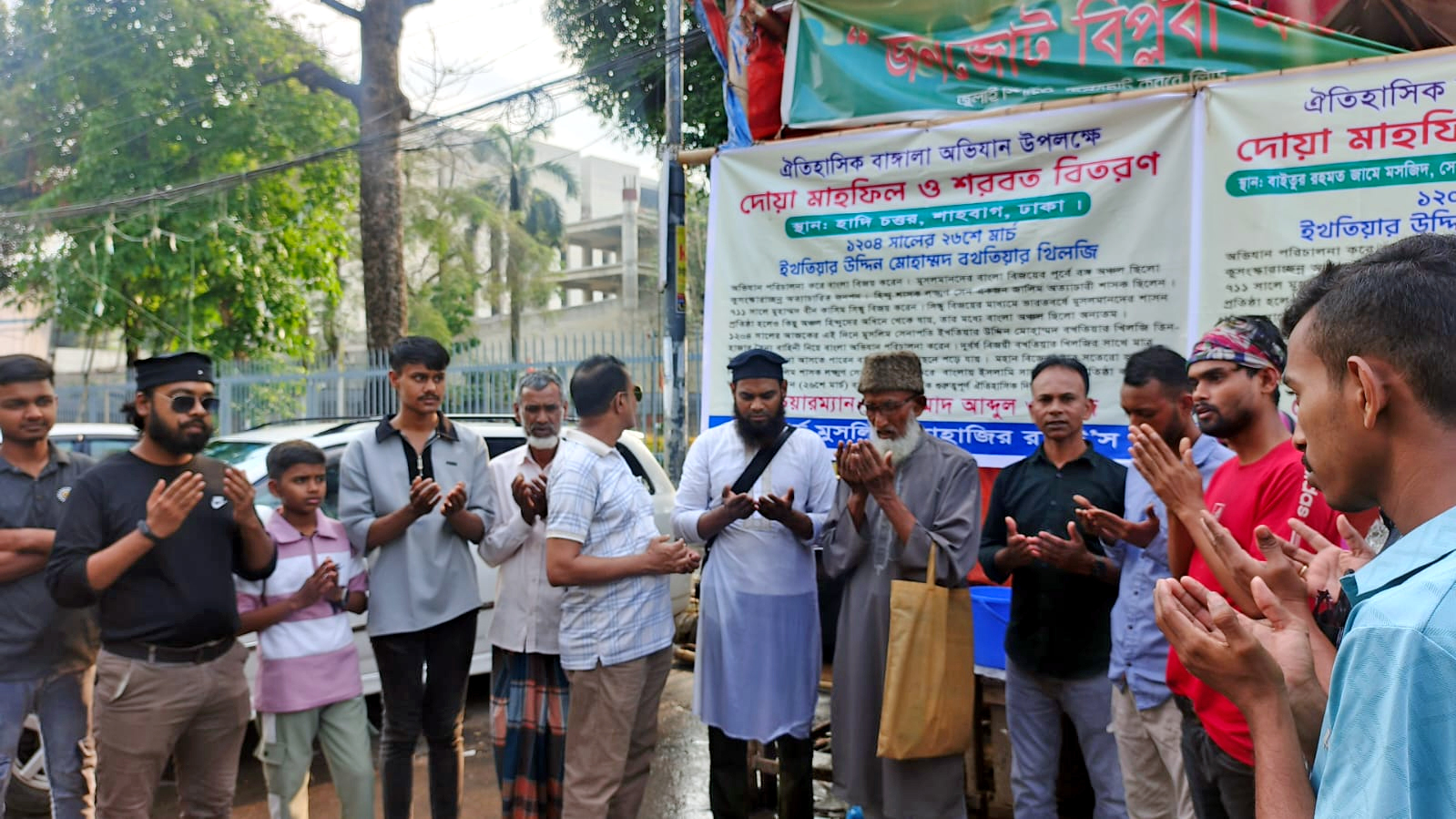 নিজস্ব প্রতিবেদকঃ ঐতিহাসিক বাংলা অভিযান ও ইখতিয়ার উদ্দিন মুহাম্মদ বখতিয়ার খিলজীর বাংলা বিজয় উপলক্ষে আজ শাহবাগের হাদী চত্বরে এক বিশেষ দোয়া মাহফিল ও শরবত বিতরণ অনুষ্ঠানের আয়োজন করা হয়। ওয়ার্ল্ড মুসলিম মুহাজির রাইটস-এর উদ্যোগে আয়োজিত হয়।
