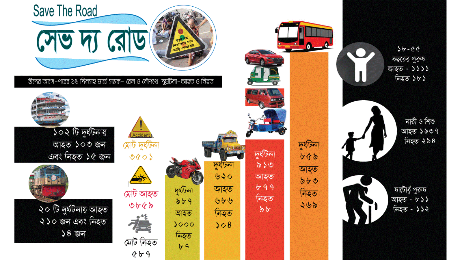 ঈদের আগে-পরের ১৫ দিনে ৩৫৮ সহ মার্চে সড়ক-রেল ও নৌপথে ঝরেছে ৫৮৭ জনের প্রাণ। গবেষণা-সচেতনা ও স্বেচ্ছাসেবি সংগঠন সেভ দ্য রোড-এর মহাসচিব শান্তা ফারজানা আরো জানান- ১৬ থেকে ৩০ মার্চ পর্যন্ত সড়ক-রেল ও নৌপথে চরম নৈরাজ্য-বিশৃঙ্খলা আর পুালিশ-প্রশাসনের কিছু কর্মকর্তা-কর্মচারির অবহেলায় ছোট-বড় ৩৫০১ টি দুর্ঘটনায় আহত হয়েছেন ৩৮৫৯ জন। সেভ দ্য রোড-এর পক্ষ থেকে আরো জানানো হয়- অদক্ষ ও ক্লান্ত চালকদের দ্বারা পরিচালিত বাস-ট্রাক দুর্ঘটনা অতিতের ঈদের চেয়ে যেমন বেশি ঘটেছে, তেমনি নারী ও শিশু হতাহত ও নিহতর ঘটনাও ঘটেছে বেশি। ১৯৩৭ জন নারী ও শিশু আহত এবং নিহত হয়েছেন ২৯৪ জন। ষাটোর্ধ¦ পুরুষ ৮১১ আহত এবং নিহত হয়েছেন ১১২ জন। ১৮-৫৫ বছর বয়সী পুরুষ ১১১১ আহত এবং নিহত হয়েছেন ১৮১ জন।