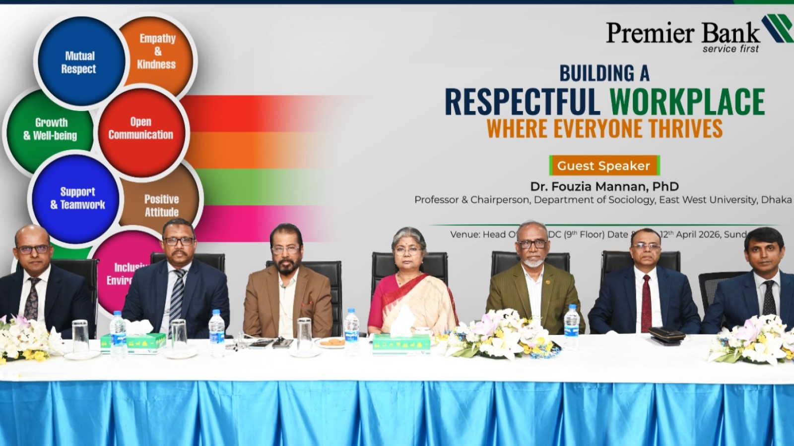 অনুষ্ঠানে অতিথি বক্তা হিসেবে উপস্থিত ছিলেন ইস্ট ওয়েস্ট বিশ্ববিদ্যালয়ের অধ্যক্ষ ও চেয়ারপারসন এবং ইউজিসি এর সেক্সুয়াল হ্যারাসমেন্ট কমিটির মেম্বার অধ্যাপক ড. ফৌজিয়া মান্নান। তিনি তার বক্তব্যে কর্মক্ষেত্রে পারস্পরিক সম্মান, ব্যক্তিগত সীমারেখা এবং ইতিবাচক সংস্কৃতি গড়ে তোলার প্রয়োজনীয়তা তুলে ধরেন। তাঁর মতে, একটি স্বাস্থ্যকর কর্মপরিবেশ কেবল নীতিমালার মাধ্যমে নয়, বরং প্রতিদিনের আচরণ, ভাষা ও পারস্পরিক সম্মানবোধের মাধ্যমেই গড়ে ওঠে।