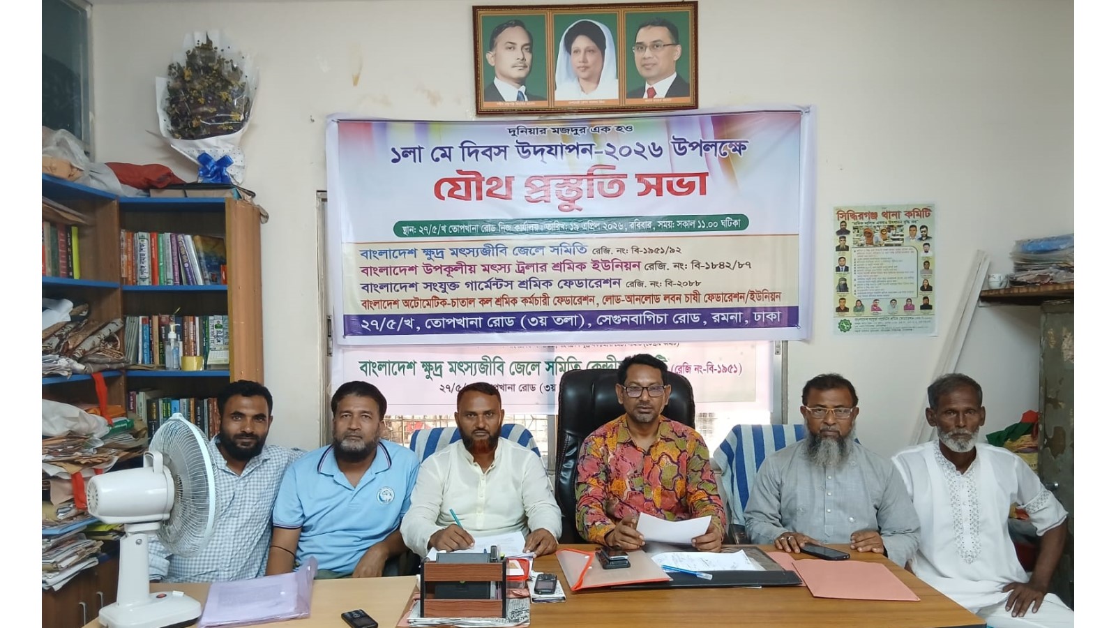 ১৯ এপ্রিল ২০২৬ রবিবার সকাল ১১:০০ ঘটিকায় বাংলাদেশ ক্ষুদ্র মৎস্যজীবী জেলে সমিতি (রেজি নং-বি-১৯৫১), বাংলাদেশ সংযুক্ত গার্মেন্টস শ্রমিক ফেডারেশন (রেজি নং-বি-২০৮৮), বাংলাদেশ লোড-আনলোড শ্রমিক-কর্মচারী ফেডারেশন, উপকূলীয় ট্রলার শ্রমিক ইউনিয়ন, বাংলাদেশ অটো চাতাল চালকল শ্রমিক কর্মচারী ফেডারেশন ১লা মে উদযাপন উপলক্ষ্যে তাদের নিজ কার্যালয়ে যৌথ প্রস্তুতি সভা করে।