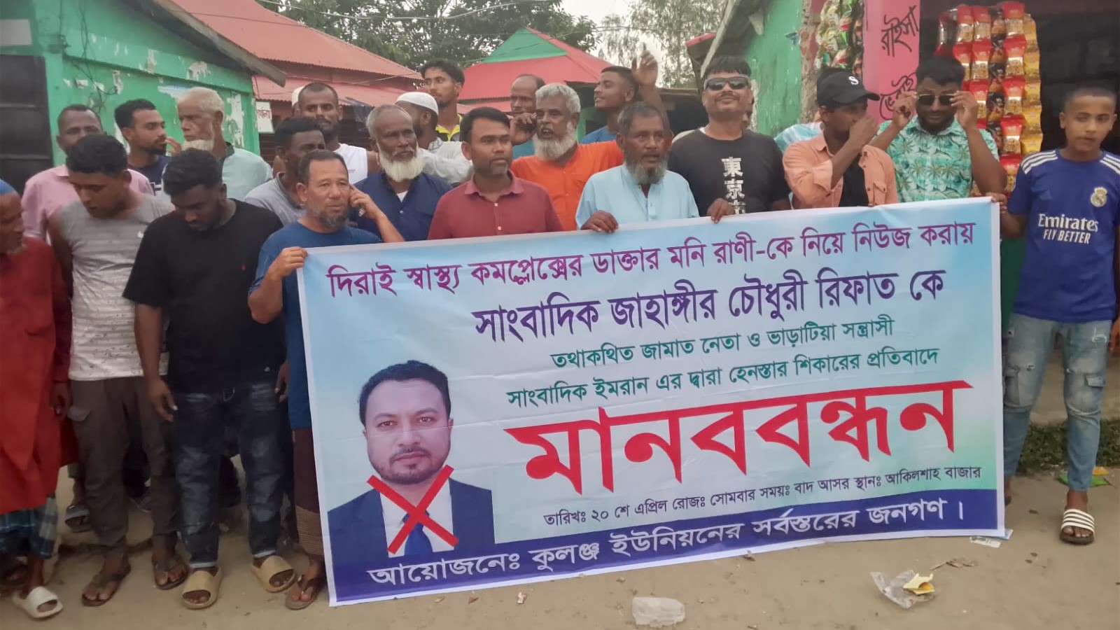মোঃ রফিকুল ইসলাম সোহাগ, সুনামগঞ্জ জেলা প্রতিনিধি: সুনামগঞ্জের দিরাইয়ে সাংবাদিক জাহাঙ্গীর চৌধুরী রিফাতের ওপর হামলা ও নির্যাতনের প্রতিবাদে মানববন্ধন অনুষ্ঠিত হয়েছে। সোমবার (২০ এপ্রিল) বিকাল ৪টায় আকিলশাহ বাজার এলাকায় এ মানববন্ধনের আয়োজন করে কুলঞ্জ ইউনিয়নের সর্বস্তরের জনগণ।
