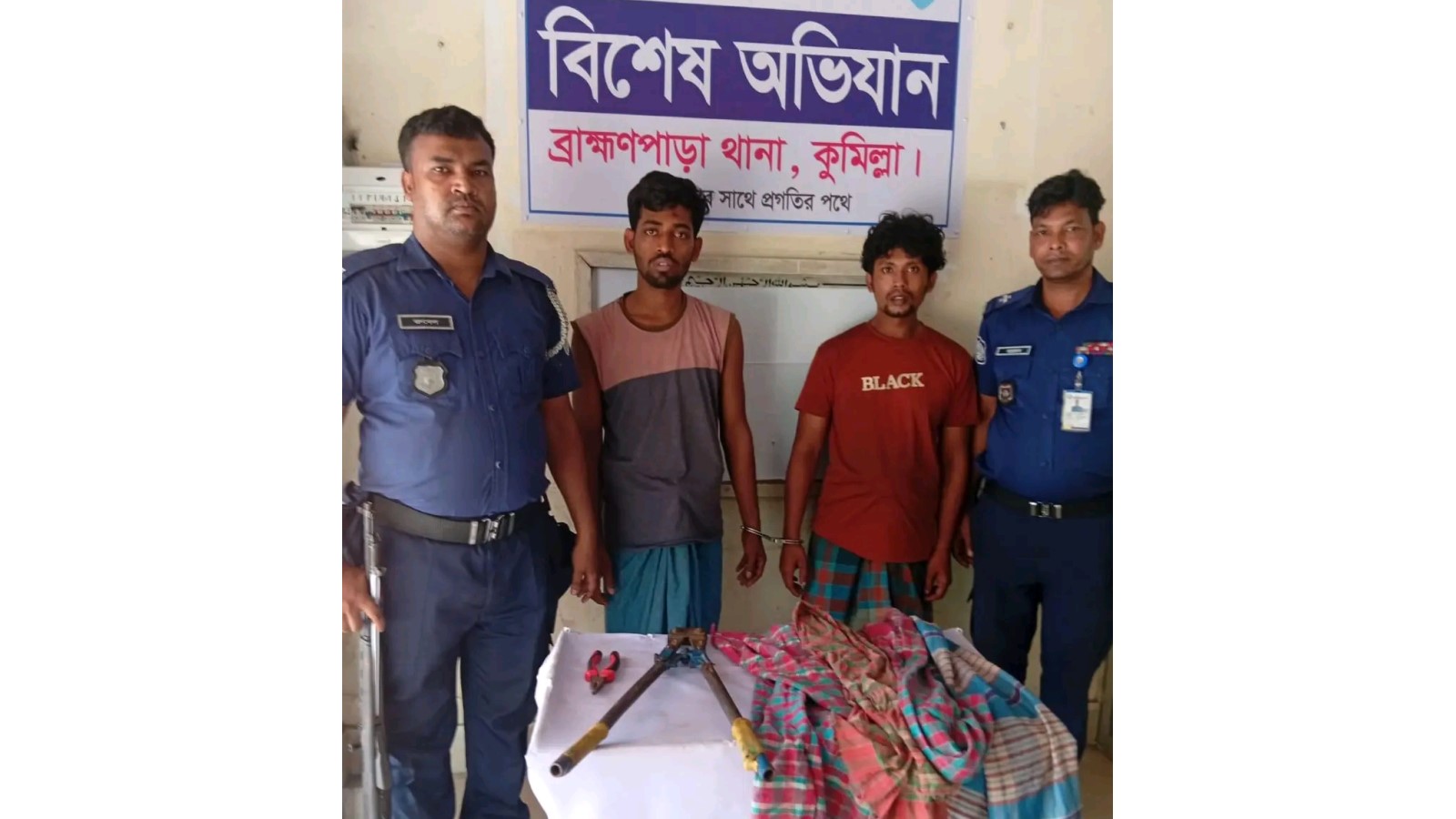 অভিযান থেকে একটি কাঁটার (প্রায় ২৪ ইঞ্চি), একটি প্লাস, একটি হাসুয়া, দুটি স্ক্রু ড্রাইভার, দুটি লোহার রড (প্রায় ২৪ ইঞ্চি), তিনটি পুরাতন গামছা, একটি পুরাতন লুঙ্গি এবং একটি নম্বরবিহীন পুরাতন সিএনজি গাড়ি উদ্ধার করা হয়।