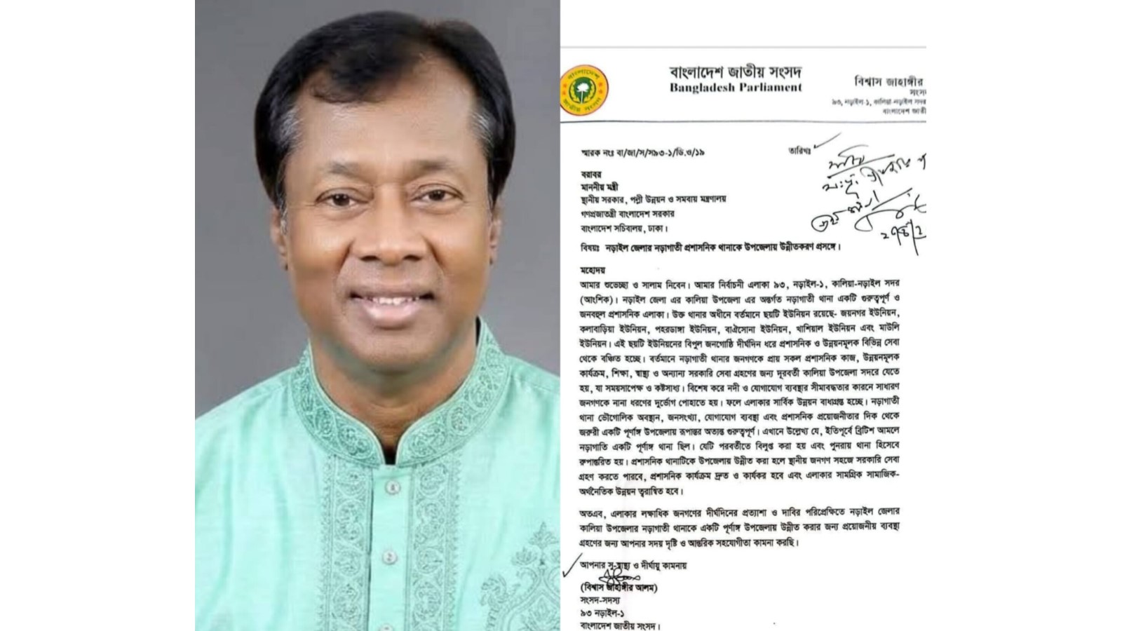 চিঠিতে তিনি উল্লেখ করেন, নড়াইল-১ আসনের অন্তর্গত নড়াগাতী থানা একটি গুরুত্বপূর্ণ জনবহুল প্রশাসনিক এলাকা। বর্তমানে এ থানার আওতায় রয়েছে ছয়টি ইউনিয়ন—জায়নগর, কলাবাড়িয়া, খাশিয়াল, বাঐসোনা, পহরডাংগা ও মাউলি ইউনিয়ন। দীর্ঘদিন ধরে এসব এলাকার জনগণ প্রশাসনিক ও উন্নয়নমূলক বিভিন্ন সেবা থেকে বঞ্চিত হয়ে আসছেন।
