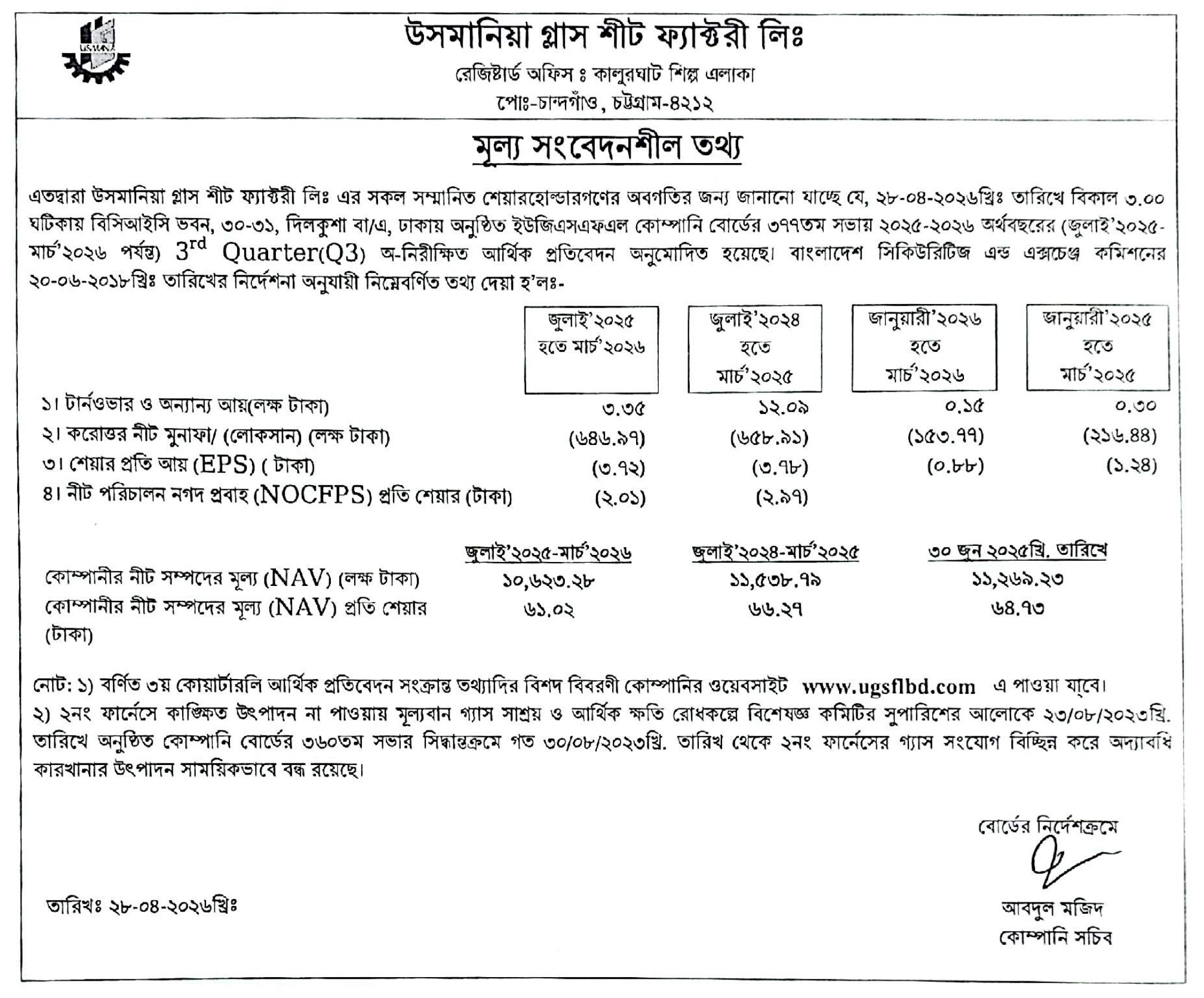 Price Sensitive Information (Q3) of Usmania Glass Sheet Factory Ltd
