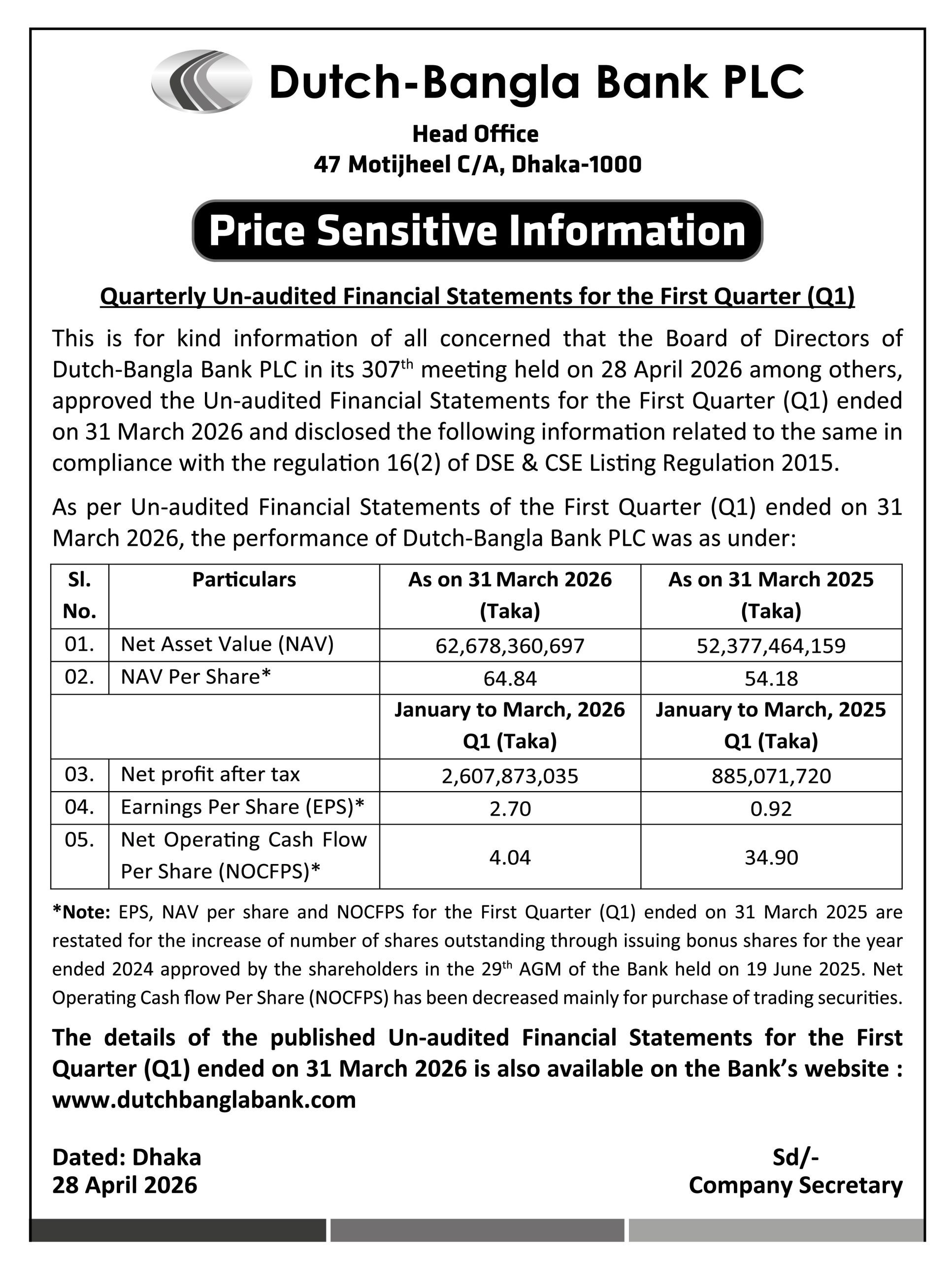 Price Sensitive Information of Dutch-Bangla Bank PLC