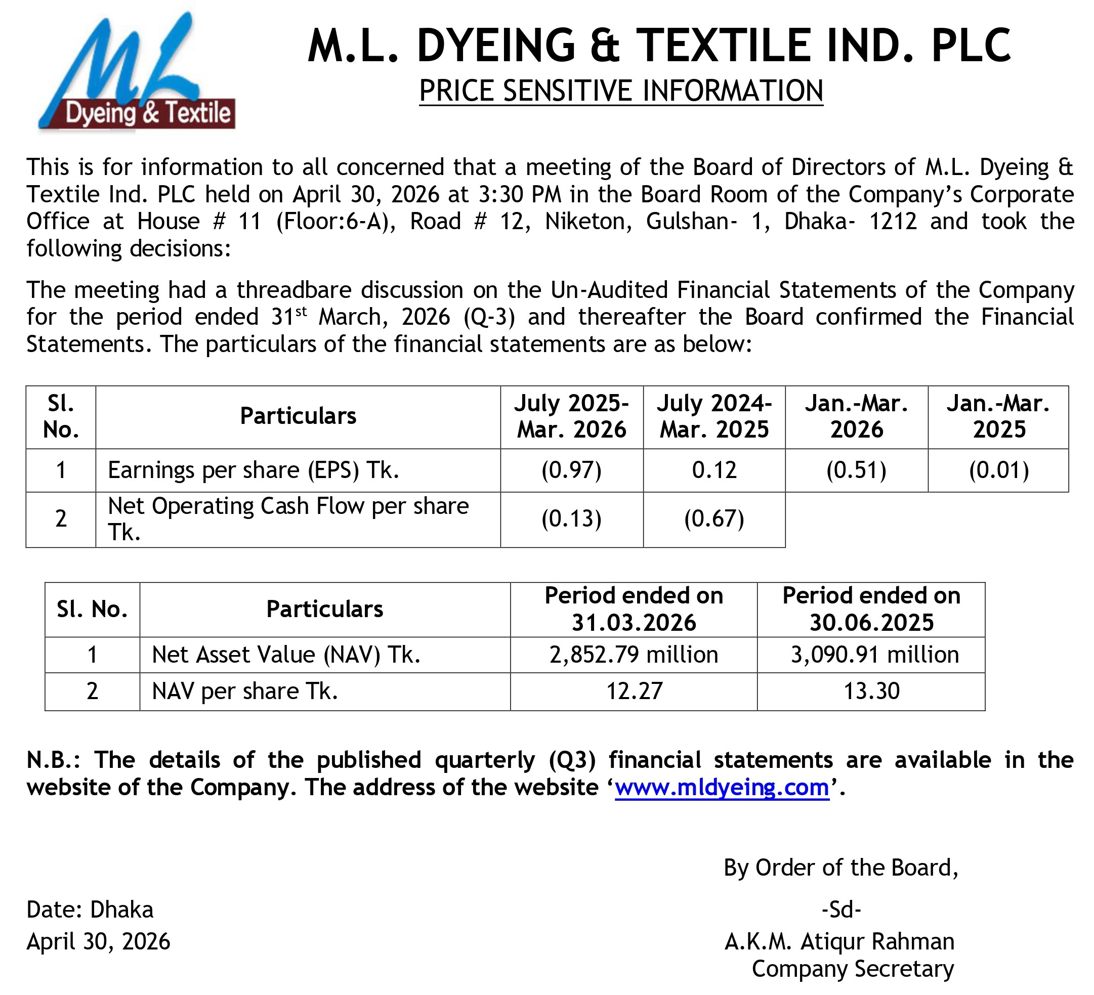 Price Sensitive Information of M.L. DYEING & TEXTILE IND. PLC