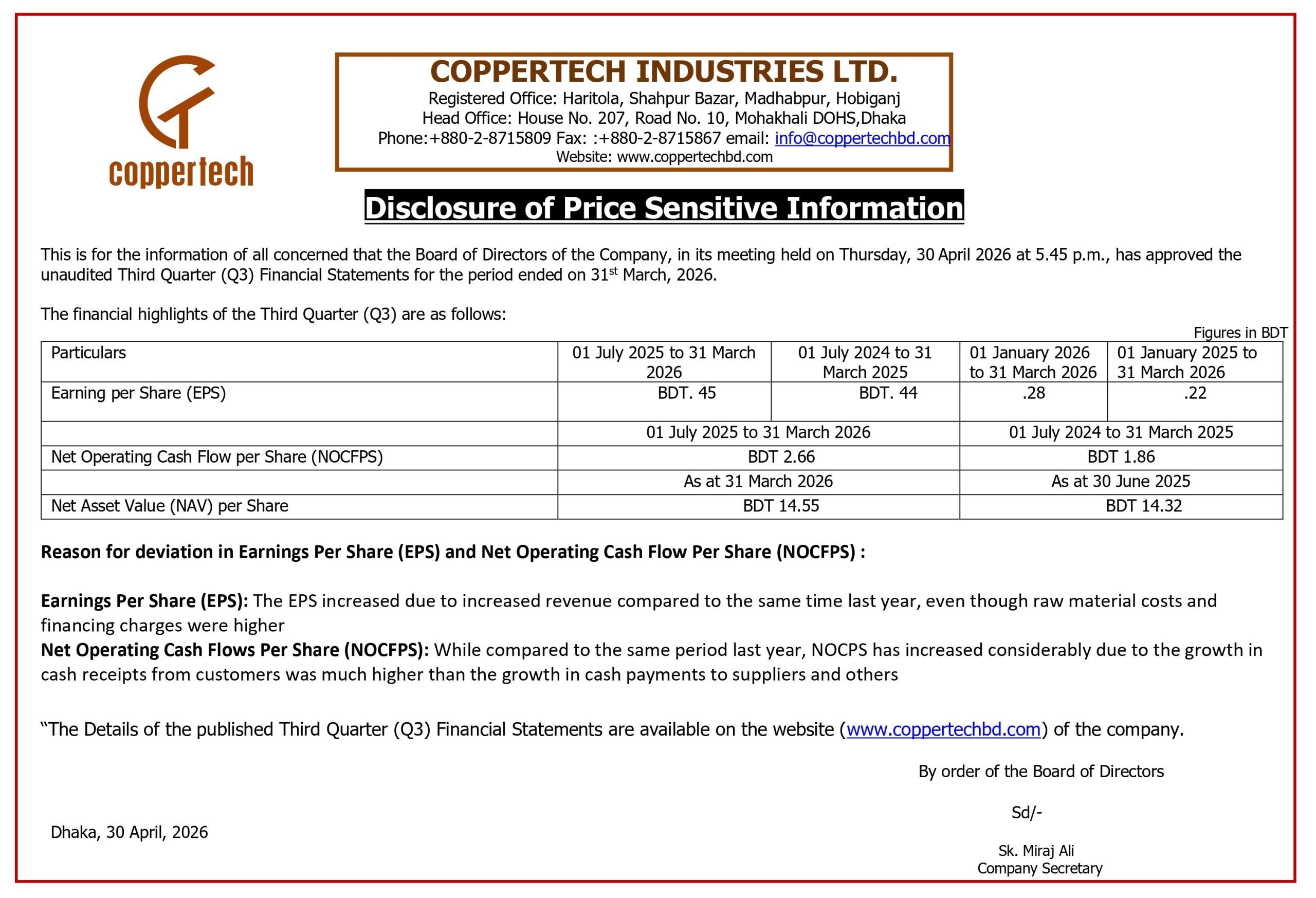 Price Sensitive Information of Coppertech Industries Ltd.
