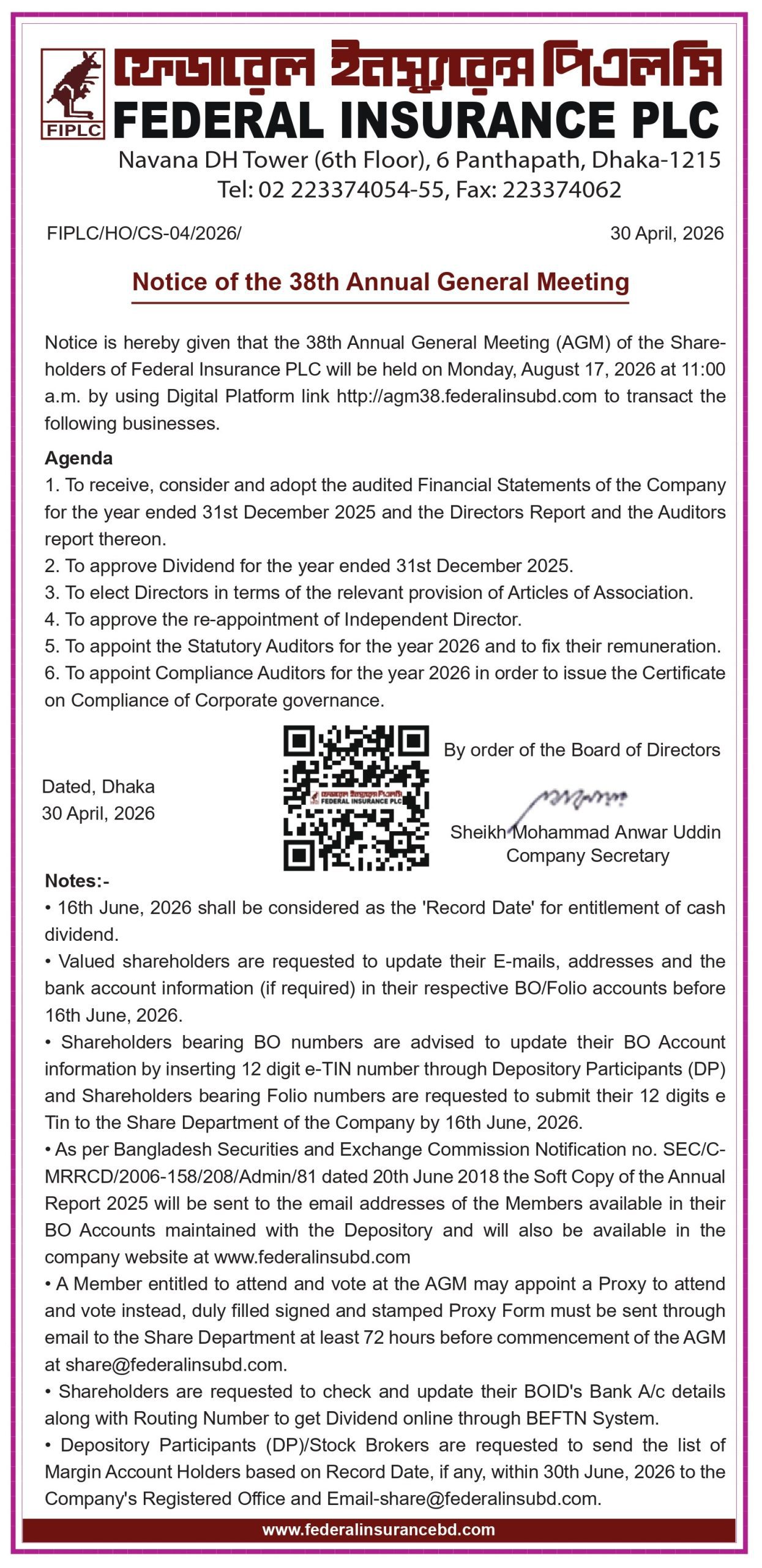 Notice of the 38th Annual General Meeting of Federal Insurance PLC