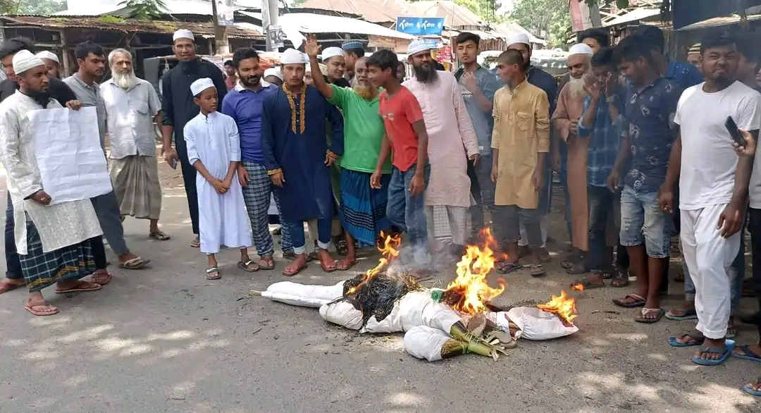 এর আগে বাজারে "বিশ্ব নবীর অপমান সইবেনা আর মুসলমান, রাসূলের শত্রুরা হুশিয়ার সাবধান, নূপুর শর্মার শাস্তি চাই; দিতে হবে দিয়ে দাও, নূপুর শর্মার দুই গালে জুতা মারো তালে তালে, নভিন কুমারের দুই গালে জুতা মারো তালে তালে" শ্লোগানে বিক্ষোভ মিছিল ও প্রতিবাদ সমাবেশ করা হয়।