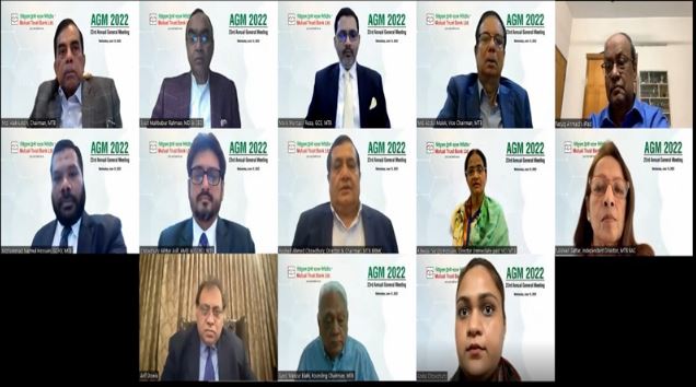 মিউচুয়াল ট্রাস্ট ব্যাংক লিমিটেডের (এমটিবি) ২৩ তম বার্ষিক সাধারণ সভা (এজিএম) ভার্চুয়ালি অনুষ্ঠিত হয়েছে। বুধবার (১৫ জুন) ডিজিটাল প্লাটফর্মের মাধ্যমে অনুষ্ঠিত সভায় ১০ শতাংশ স্টক ডিভিডেন্ড অনুমোদন করা হয়েছে।
