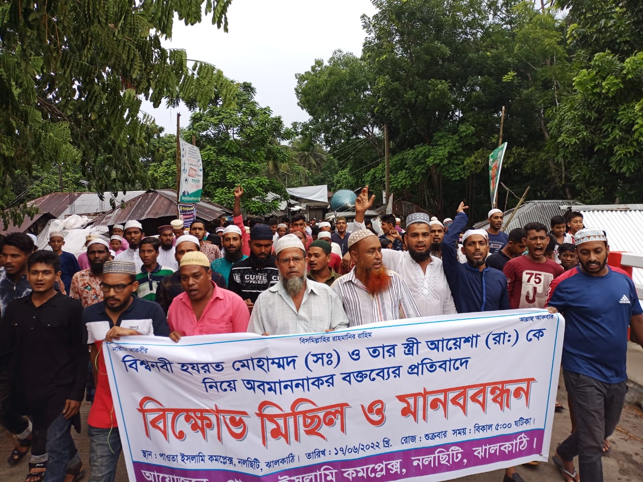 নিজস্ব প্রতিবেদক, মহানবী হযরত মুহাম্মদ (সা.) ও হযরত আয়েশা (রা.) কে নিয়ে ভারতের দুই বিজিপির অবমাননাকর কুরুচিপূর্ণ বক্তব্যের প্রতিবাদে জড়িতদের বিচারের দাবীতে বিক্ষোভ সমাবেশ ও মিছিল করেছে নলছিটির পাওতা গ্রামের সর্বস্তরের ধর্মপ্রাণ মুসলমান।