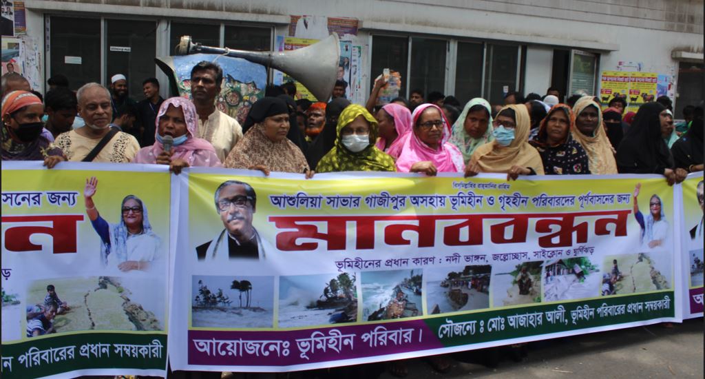 নিজস্ব প্রতিনিধি (ছবি) হাসুঃ আমরা আশুলিয়া, সাভার ও গাজীপুরের ভূমিহীন পরিবারের সদস্যবৃন্দ। নদী ভাঙ্গন, সাইক্লোন ও ঘূর্ণিঝড়ের মতো বিভিন্ন প্রাকৃতিক দুর্যোগে ফসলি জমি, বসত ভিটা ও ঘর-বাড়িসহ সবকিছু হারিয়ে দিশেহারা হয়ে পরিবার পরিজন নিয়ে জীবন বাঁচানোর তাগিদে আশুলিয়া, সাভার ও গাজিপুরের বিভিন্ন অঞ্চলে সরকারী খতিয়ানভুক্ত খাস জমিতে অস্থায়ীভাবে ছোট ছোট চালা আকারে বানিয়ে আমরা বসবাস করে আসছি। স্থায়ী সমাধানের জন্য সরকারের কাছে আমরা দীর্ঘদিনযাবৎ দাবি জানিয়ে আসছি। কিন্তু আজ পর্যন্ত কোনো স্থায়ী সমাধান হয়নি। আমাদের দেশ স্বাধান হওয়ার আগে ৭ মার্চের ভাষণে বঙ্গবন্ধু বলেছিলেন দেশ স্বাধীন হলে এদেশে কোনো ভূমিহীন ও গৃহহীন পরিবার থাকবে না। কিন্তু দুঃখের বিষয় হলেও সত্য যে, বাংলাদেশ স্বাধীন হওয়ার পর বাংলাদেশে অনেক সরকারের পরিবর্তন হলেও এখন পর্যন্ত সেই ঘোষণা বাস্তবায়ন হয়নি। ভূমিহীনদের বিভিন্ন নীতিমালা থাকলেও ভূমিহীনদের ভাগ্যের কোনো পরিবর্তন দেখা যায়নি। ১৯৯৬ সালে বর্তমান প্রধানমন্ত্রী ভূমিহীনদের জন্য বিভিন্ন নীতিমালা চালু করলেও বাস্তবে সেগুলো সময়ের অভাবে সমাপ্ত করতে পারেনি। বর্তমান সরকার ক্ষমতায় আসার পরও ২০২০ সালে সরকার বিভিন্ন নীতিমালা চালু করেছে। এদিকে, ভূমিহীন ও গৃহহীনদের পুনর্বাসন করবে বলে আশ্বস্থ্য করে এক ভিডিও কনফারেন্সে প্রধানমন্ত্রী বলেছেন, “দেশে কোনো ভূমিহীন ও গৃহহীন থাকবে না।" ২০২২ সালের ৮ মে সংবাদ সম্মেলনে প্রধানমন্ত্রী একই কথা ব্যক্ত করেছেন যে, ভূমিহীন ও গৃহহীনদের পুনর্বাসন করা হবে। এছাড়া গত ৮ জুন সংসদে প্রধানমন্ত্রী ভূমিহীন ও গৃহহীনদের পুনর্বাসন করবে বলেও আশ্বস্থ করেছেন। সবশেষ গত ২৫ জুন পদ্মা সেতু উদ্বোধনের সময়ও প্রধানমন্ত্রী ভূমিহীন ও গৃহহীনদের পুনর্বাসন করার আশ্বস্থ্য করেছেন।