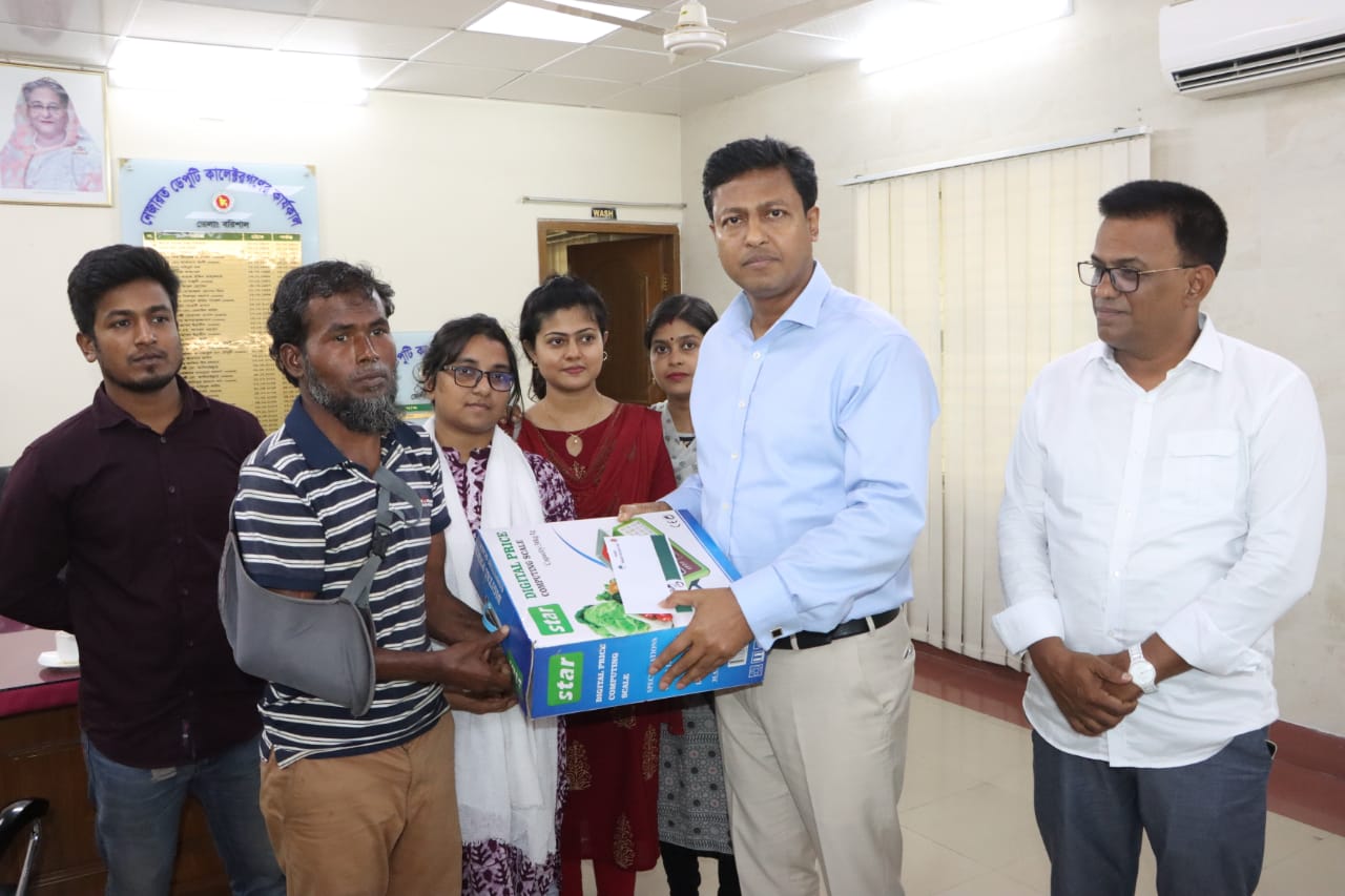 এস এল টি তুহিন, বরিশাল : বরিশাল জেলার বাবুগঞ্জ উপজেলার বাসিন্দা ছোট বেলায় ১ বছর বয়সে বাড়ির উঠনে ধান সিদ্ধ করার চুলায় পড়ে গিয়ে দুইটি পা আগুনে পুরে যায়। অল্পের জন্য জীবনে বেচে গেলেও ১৪ বছর আগুনে পোড়া ক্ষত-র সাথে যুদ্ধ করে অবশেষ পা দুটো কেটে ফেলতে হয়। জীবনের তরে পঙ্গু হয়ে যায় ছানাউল। জীবনের সাথে অনবরত যুদ্ধ করে পড়াশোনা চালিয়ে যান এবং অবশেষে ডিগ্রি পাশ করেন। পাশ করে একটি এনজিওতে চাকরি করতেন বিবাহিত জীবনে তার স্ত্রী, ১ পুত্র এবং ১ কন্যা সন্তান নিয়ে ভালোভাবেই জীবন কাটাতে থাকে তিনি। এরমধ্যে এনজিও প্রোজেক্ট শেষ হয়ে গেলে বিপাকে পড়েন ছানাউল ও তার পরিবার। বিষয়টি জেলা প্রশাসক বরিশাল জসীম উদ্দীন হায়দার এর নজরে আসলে আজ ৫ জুলাই মঙ্গলবার দুপুরে সার্কিট হাউজ সম্মেলন কক্ষে ব্যবসা করার জন্য তার হাতে নগদ ২০ হাজার টাকা তুলে দেন বরিশাল জেলা প্রশাসক জসীম উদ্দীন হায়দার। এ সময় মোঃ আব্দুল আউয়াল হোসেন নামের এক সবজি বিক্রেতা কে ওজন যন্ত্র ও নগদ ৩ হাজার টাকা সহায়তা প্রদান করে জেলা প্রশাসক। আউয়াল ঢাকায় একটি ফ্যাশন হাউজ চাকরি করতেন। করোনাকালিন সময়ে লকডাউন চলাকালীন তিনি বরিশাল জেলার বাকেরগঞ্জ উপজেলার চরাদী ইউনিয়নে নিজ বাড়িতে ফেরার সময় মোটরসাইকেল দুর্ঘটনা ডান হাত ভেঙ্গে যায়। অপারেশন করে হাতে একটি বড়ো রড দিয়ে দেওয়া হয়েছে। এখন সে কিছুটা সুস্থ হলেও সাবা বিক জীবনে ফিরতে পারছেনা। আউয়াল এর ১ ছেলে ও দুই মেয়েকে নিয়ে কষ্টে জীবন অতিবাহিত করছে। জীবিকা নির্বাহের জন্য বর্তমানে সে সবজি বিক্রি করে পরিবারের মুখে খাবার জোটাচ্ছ। বিষয়টি স্বেচ্ছাসেবী সংগঠন সহচরী এর নজরে আসলে জেলা প্রশাসক বরিশাল এর নজরে আনলে আজ তাকে এই সহযোগিতা করা হয়। এসময় উপস্থিত ছিলেন সহকারী কমিশনার জেলা প্রশাসকের কার্যালয় বরিশাল মুশফিকুর রহমান, অংমাচিং মারমা, প্রবেশন অফিসার জেলা প্রশাসকের কার্যালয় বরিশাল সাজ্জাদ পারভেজসহ সহচরী সংগঠনের সদস্য উপস্থিত ছিলেন। জেলা প্রশাসক বরিশাল জসীম উদ্দীন হায়দার নিজ হাতে এই অর্থ সহায়তা ও পরিমাপ যন্ত্র তুলে দেন দরিদ্র ছানাউল ও অসহায় আউয়াল এর হাতে