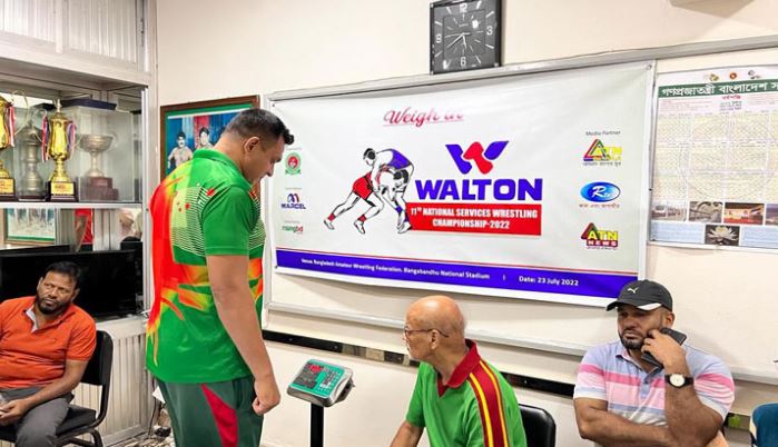 ওয়ালটন গ্রুপের পৃষ্ঠপোষকতায় ও বাংলাদেশ অ্যামেচার রেসলিং ফেডারেশনের ব্যবস্থাপনায় আজ শনিবার (২৩ জুলাই) ওজন গ্রহণের মধ্য দিয়ে শুরু হয়েছে ‘ওয়ালটন ১১তম জাতীয় সার্ভিসেস (পুরুষ ও মহিলা) কুস্তি প্রতিযোগিতা-২০২২।’ আজ মোট ৮০ জনের ওজন নেওয়া হয় এবং বিভিন্ন ওজন শ্রেণির গ্রুপিং করা হয়।