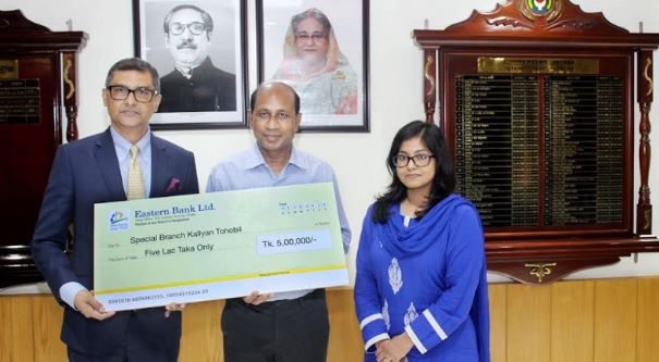 বাংলাদেশ পুলিশের প্রধান গোয়েন্দা সংস্থার বিশেষ শাখা বা এসবি (স্পেশাল ব্রাঞ্চ)-এর কল্যাণ তহবিলে অনুদান দিয়েছে ইস্টার্ণ ব্যাংক লিমিটেড (ইবিএল)। রোববার (৩১ জুলাই) রাজধানীর এসবি প্রধান কার্যালয়ে ইবিএল এ অনুদানের চেক হস্তান্তর করে।