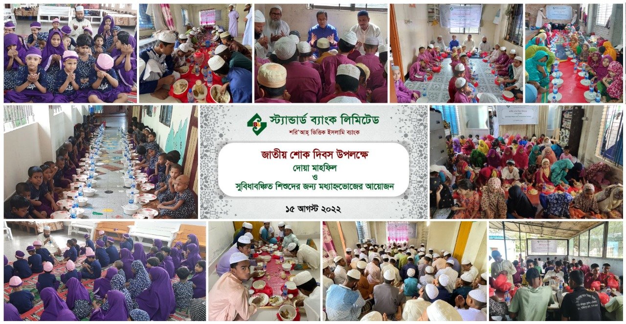 জাতির পিতা বঙ্গবন্ধু শেখ মুজিবুর রহমানের ৪৭তম শাহাদাৎ বার্ষিকী ও জাতীয় শোক দিবস পালনের অংশ হিসেবে স্ট্যান্ডার্ড ব্যাংক লিমিটেড স্যার সলিমুল্লাহ মুসলিম এতিমখানা, ছোটমনি নিবাস ও চাইল্ড ডে কেয়ার সেন্টারের এক হাজারেরও বেশি সুবিধাবঞ্চিত শিশুদের জন্য মধ্যাহ্নভোজের আয়োজন করেছে। উলূম নাহুইস সুন্নাহ মাদ্রাসা ও এতিমখানা, জামিয়া সাইদিয়া আরাবিয়া মাদ্রাসা, ঢাকার এমদাদিয়া আরাবিয়া মাদ্রাসা এবং ভবানীপুর গার্লস এতিমখানা ও মাদ্রাসা, গাজীপুর ১৫ আগস্ট ২০২২,। মধ্যাহ্নভোজ শুরুর আগে দোয়া মাহফিল অনুষ্ঠিত হয় এবং বঙ্গবন্ধু শেখ মুজিবুর রহমান, তার পরিবারের সদস্য ও ১৯৭৫ সালের ১৫ আগস্টের অন্যান্য শহীদদের বিদেহী আত্মার মাগফেরাত কামনা করে দোয়া করা হয় এবং বঙ্গবন্ধুর আদর্শ আমাদের হৃদয়ে উজ্জীবিত করার জন্য দোয়া করা হয়। আমাদের জাতীয় জীবনের সকল স্তর। স্ট্যান্ডার্ড ব্যাংকের ঊর্ধ্বতন কর্মকর্তা এবং মাদ্রাসা ও এতিমখানার শিক্ষক-কর্মচারীরা এ সময় উপস্থিত ছিলেন।