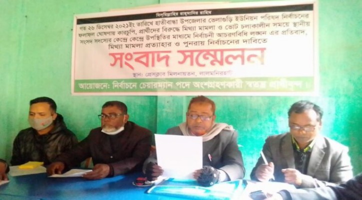 রেজাউল ইসলাম,হাতীবান্ধ,লালমনিরহাট: লালমনিরহাটের হাতীবান্ধা উপজেলার ভেলাগুড়ি ইউনিয়ন পরিষদ নির্বাচনে চেয়ারম্যান পদে অংশগ্রহণকারী স্বতন্ত্র প্রার্থীবৃন্দ মোঃ আব্দুস সাত্তার ও মোঃ মহির উদ্দিন গত ২৬ ডিসেম্বর ২০২১ইং তারিখে হাতীবান্ধা উপজেলার ভেলাগুড়ি ইউনিয়ন পরিষদ নির্বাচনের ফলাফল ঘোষণায় কারচুপি,প্রার্থীদের বিরুদ্ধে মিথ্যা মামলা ও ভোট চলাকালীন সময়ে স্থানীয় সংসদ সদস্যের কেন্দ্রে কেন্দ্রে উপস্থিতির মাধ্যমে নির্বাচনী আচরণবিধি লঙ্ঘন এর প্রতিবাদ, মিথ্যা মামলা প্রত্যাহার ও পুনরায় নির্বাচনের দাবিতে সংবাদ সম্মেলন করেছেন।