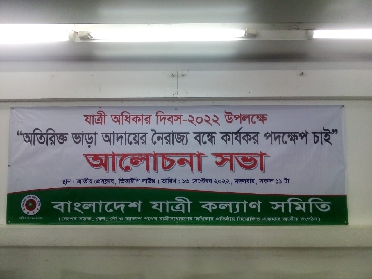 আজ ১৩ সেপ্টেম্বর সকালে নগরীর জাতীয় প্রেসক্লাবের তোফাজ্জল হোসেন মানিক মিয়া হলে ৪র্থ যাত্রী অধিকার দিবস উপলক্ষে বাংলাদেশ যাত্রী কল্যাণ সমিতি আয়োজিত "অতিরিক্ত ভাড়া আদায়ের নৈরাজ্য বন্ধের কার্যকর পদক্ষেপ চাই” শীর্ষক আলোচনা সভায় বক্তারা এই অভিযোগ তুলেন।