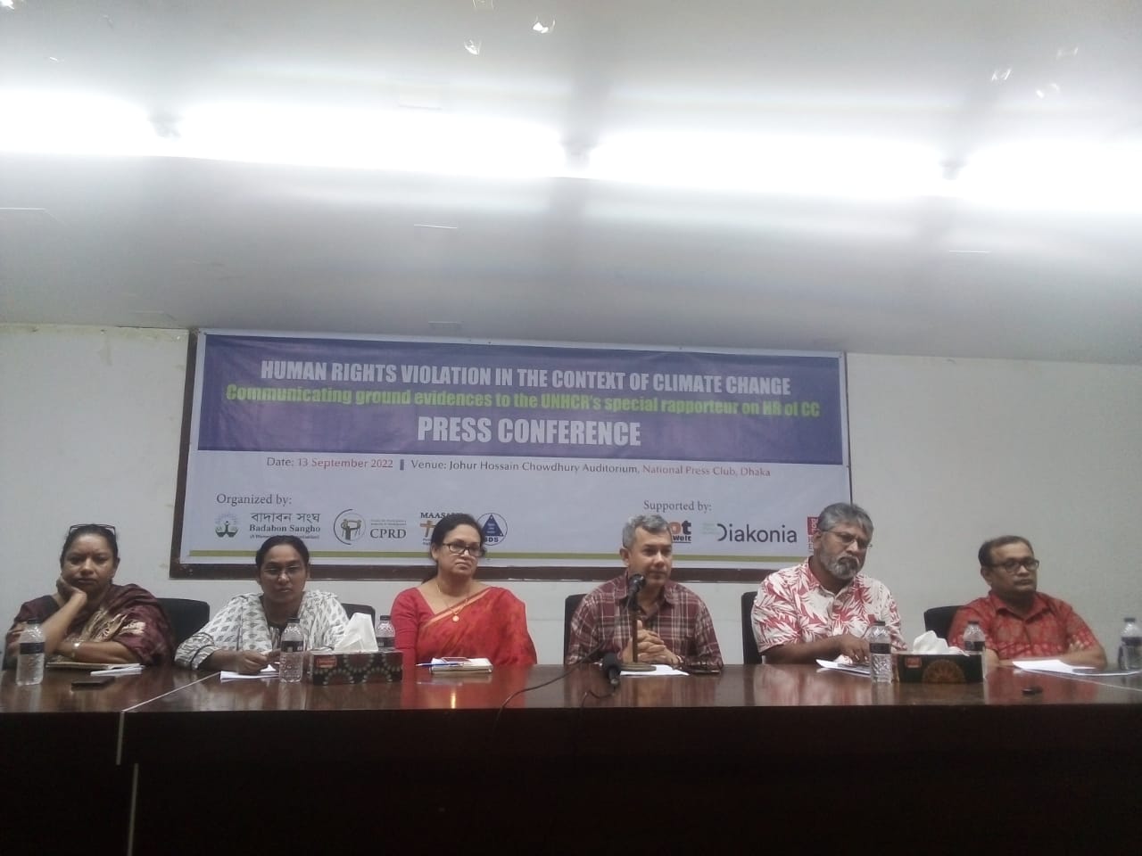 জলবায়ু পরিবর্তনের স্থান, সম্প্রদায় ও ব্যক্তি পর্যায়ে ভিন্ন ও বহুমূখী বিপদাপন্নতা যাচাইয়ের লক্ষ্যে অতি সম্প্রতি সিপিআরডি তিনটি অঞ্চলিক সংগঠনের সহযোগিতায় (এস.ডি.এস. বাদবন সংঘ, মাসাউস) দেশের তিনটি জলবায়ু অভিঘাতপূর্ণ অঞ্চলে (Climate stressed areas) (দক্ষিণ-পশ্চিম উপকূলীয় অঞ্চল — বাগেরহাট জেলা, গঙ্গা-মেঘনা-ব্রহ্মপুত্র অববাহিকার (GMB) নিম্নাঞ্চল— শরীয়তপুর জেলা, এবং খরা ও অনিয়মিত বৃষ্টিপাত প্রবণ বরেন্দ্র অঞ্চল – রাজশাহী জেলা) একটি গবেষণা কার্যক্রম পরিচালনা করে। ২০২২ সালে পরিচালিত এই গবেষণায় একই জনগোষ্ঠীর বিপদাপন্নতার ভিন্নতা ও ক্ষেত্র বিশেষে মানবাধিকার লঙ্ঘনের বিষয়টিও উঠে এসছে।