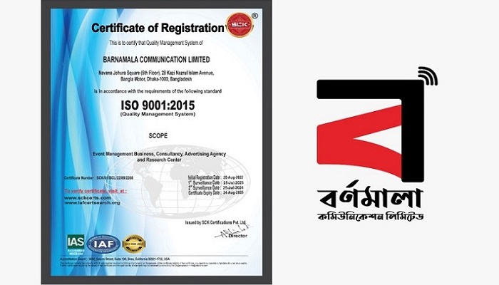 ব্যবসায় পরিচালনার আন্তর্জাতিক মান বজায় রাখার স্বীকৃতি হিসেবে আইএসও (ISO) সনদ পেল দেশের স্বনামধন্য বিজ্ঞাপনী এবং ইভেন্ট ম্যানেজমেন্ট প্রতিষ্ঠান বর্ণমালা কমিউনিকেশন লিমিটেড। গুণগত মানোন্নয়নের ধারাবাহিকতায় প্রতিষ্ঠানটি ইন্টারন্যাশনাল স্ট্যান্ডার্ডাইজেশন অর্গানাইজেশন আইএসও ৯০০১:২০১৫ সনদ অর্জন করলো।