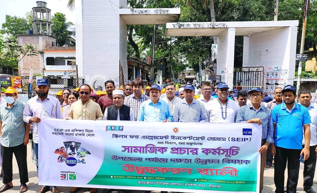 এস এল টি তুহিন,বরিশাল: সামাজিক প্রচার কর্মসুচীর আওতায় স্কিলস ফর এমপ্লয়মেন্ট ইনভেস্টমেন্ট প্রোগ্রাম (SEIP) অর্থ মন্ত্রনালয়ের উদ্যোগে দক্ষতা উন্নয়ন অবহিতকরন প্রশিক্ষণ কর্মশালা র্যালি ও আলোচনা সভা অনুষ্ঠিত হয়েছে । আজ সোমবার (২৭ সেপ্টেম্বর ) বরিশাল সদর উপজেলা পরিষদ চত্তরে বিভিন্ন শিক্ষা প্রতিষ্ঠানের শিক্ষার্থীদের নিয়ে একটি র্যালি বের হয়। র্যালি শেষে উপজেলা পরিষদ মিলনায়তনে কর্মশালা হয়।
