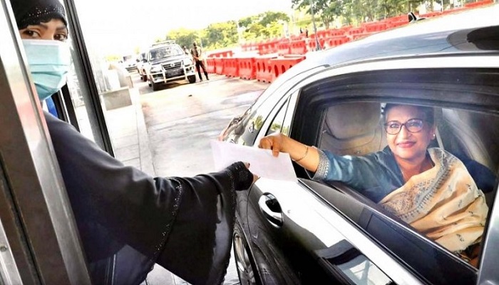 সেতু পাড়ি দেওয়ার আগে শেখ রেহানা টোল প্লাজায় সফরে থাকা বহরের ১৭টি গাড়ির টোল পরিশোধ করেন।