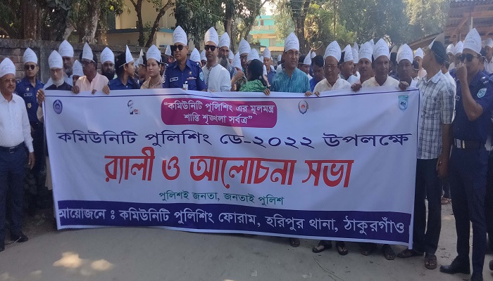 হরিপুর(ঠাকুরগাঁও)প্রতিনিধিঃ কমিউনিটি পুলিশিং এর মূলমন্ত্র শান্তি শৃঙ্খলা সর্বত্র, এই প্রতিপাদ্যকে সামনে রেখে ঠাকুরগাঁওয়ের হরিপুরে গতকাল শনিবার হরিপুর থানা কমিউনিটি পুলিশিং ফোরামের আয়োজনে সকাল ১০টায় র্যালী ও আলোচনা সভা অনুষ্ঠিত হয়েছে। দিবসের কর্মসুচি অনুয়াযী সকাল সাড়ে ৯টায় থানা চত্ত্বরে বেলুন ও শান্তির পায়রা উড়িয়ে উপজেলা নির্বাহী অফিসার বহ্নি শিখা আশা অনুষ্ঠানের শুভ উদ্ধোধন করেন। থানার অফিসার ইনচার্জ তাজুল ইসলামের নেতৃত্বে এক বণ্যাঢ্য র্যালী বের করে উপজেলার প্রধান প্রধান সড়ক গুলি প্রদক্ষিন শেষে কমিউনিটি পুলিশিং ফোরামের সভাপতি আফজাল হোসনের সভাপতিত্বে উপজেলা পরিষদের হলরুমে এক আলোচনা সভা অনুষ্ঠিত হয়। সভায় প্রধান অতিথি হিসাবে বক্তব্য রাখেন উপজেলা নির্বাহী অফিসার বহ্নি শিখা আশা,বিশেষ অতিথি হিসাবে বক্তব্য রাখেন ভাইস চেয়ারম্যান আব্দুল কাইযুম পুস্প ও মোতাহারা পারভীন, আ‘লীগের সাধারন সম্পাদক এস এম আলমগীর,জেলা পরিষদ সদস্য আনিসুজ্জামান শান্ত ও সাবিনা ইয়াসমিন রিপা, সভায় আরো বক্তব্য রাখেন , ইউনিয়ন পরিষদের চেয়াম্যান মোঃআবুতাহের, মোঃপাভেল তালুকদার,বীরমুক্তিযোদ্ধা নগেনকুমার পাল। সভায় স্বাগত বক্তব্য রাখেন থানার অফিসার ইনচার্জ তাজুল ইসলাম।