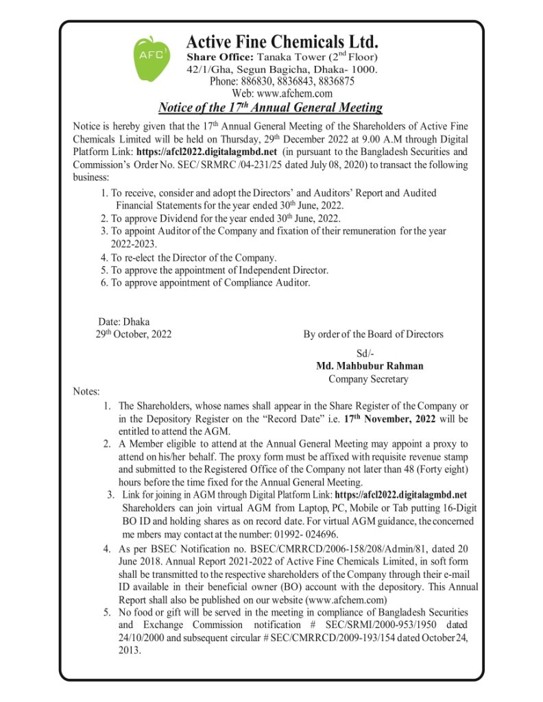 Notice of the 17th Annual General Meeting Active Fine Chemicals Ltd.