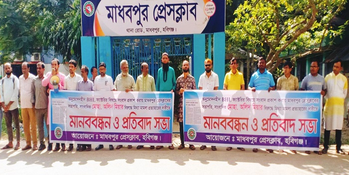 প্রতিবাদ সভায় বক্তব্য রাখেন মাধবপুর প্রেসক্লাবের সেক্রটারী সাবিবর হাসান, সহ-সভাপতি মাঃ আবুল খায়ের, সুব্রত দেব, আলমগীর কবির, বীরমুক্তিযোদ্ধা ডাঃ সুখেন দেবনাথ, সাবেক সভাপতি রোকন উদ্দিন লস্কর,শংকর পাল সুমন, সিনিয়র কাওছার আহমদ, সাংবাদিক সানাউল হক শামীম, হীরেশ ভট্টাচার্য্য, আবুল হোসেন সবুজ,রাজিব দেব রায় রাজু, বিপ্লব আচার্য্য সুজন, রাখাল দে, একলামুল আলম লেবু, ইলিয়াছ কাঞ্চন তানহা
