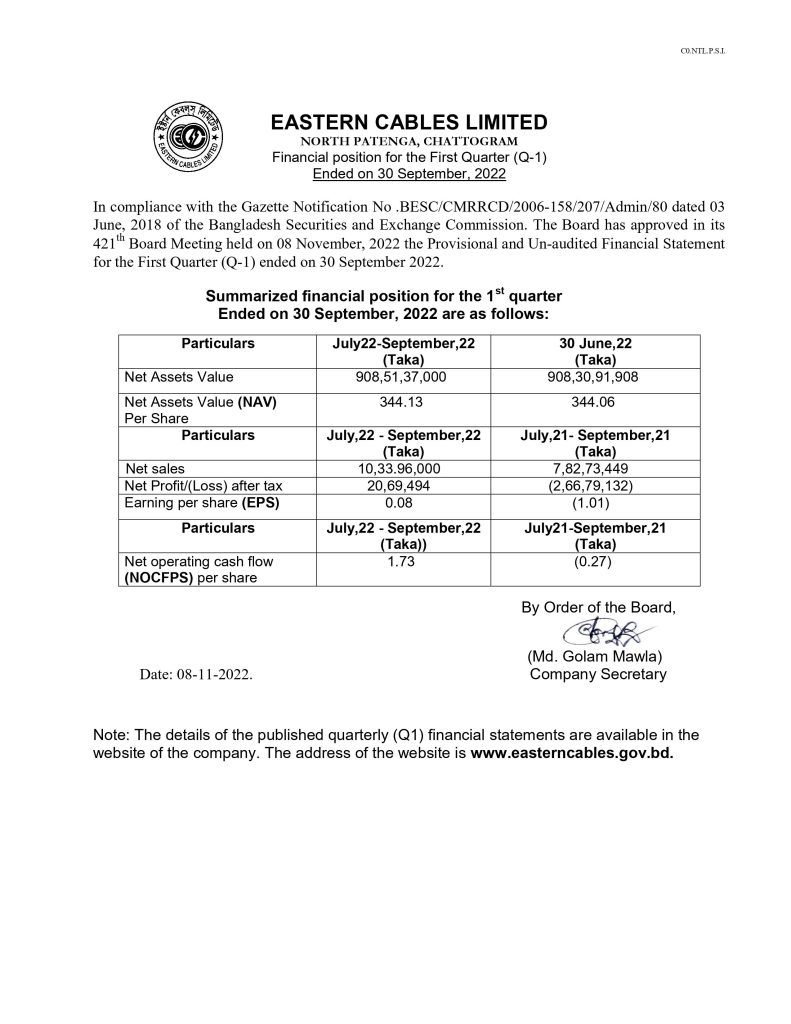Financial Position for the First Quater (Q1) of Eastern Cables Ltd.